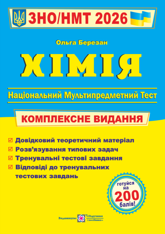 Посібник призначений для підготовки до ЗНО та НМТ 2026 року. Він містить теоретичний матеріал, поданий відповідно до чинної програми з хімії для загальної середньої освіти та програми ЗНО 2026; приклади розв’язання типових задач; тематичні тестові завдання.