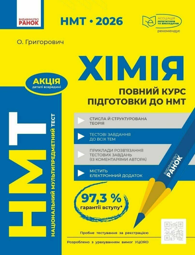 Посібник призначений для підготовки до НМТ 2026 року з хімії. Видання створено з метою якісної та ефективної підготовки до складання національного мультипредметного тесту з хімії. За цим посібником учні та учениці можуть готуватись як самостійно, так і на шкільних уроках або заняттях із репетитором. Для всіх учасників та учасниць освітнього процесу, хто прагне здобути й удосконалити знання з хімії.