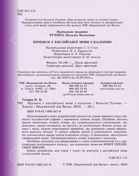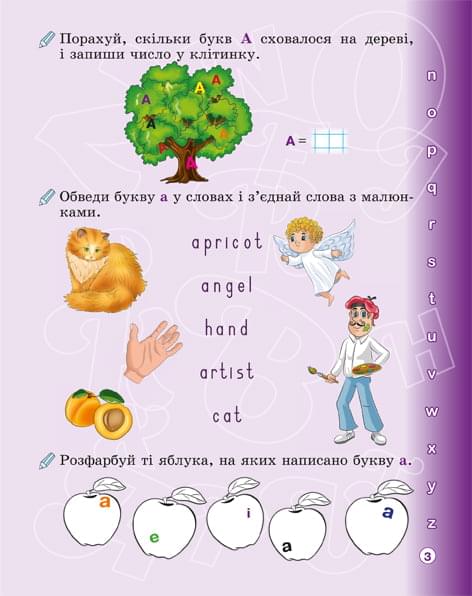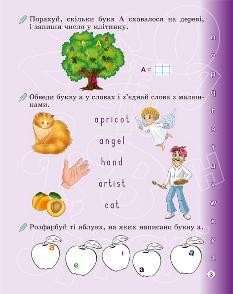 Пропонований зошит розроблений допомогти учням першого класу вивчити англійський алфавіт і навчитися писати літери. Посібник містить зразок написання кожної літери, що супроводжується стрілочками, які вказують, звідки починати, як писати і де закінчувати. Кожна літера, велика і мала, подана пунктірним шрифтом, що допоможе учневі сформувати навичку письма. У зошиті дібрані цікаві й різноманітні завдання, що допомагають краще запам’ятовувати літеру, її написання, збагачувати словниковий запас. Урізноманітнюють зошит завдання з калькою.