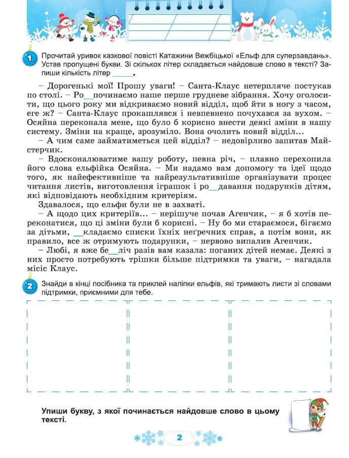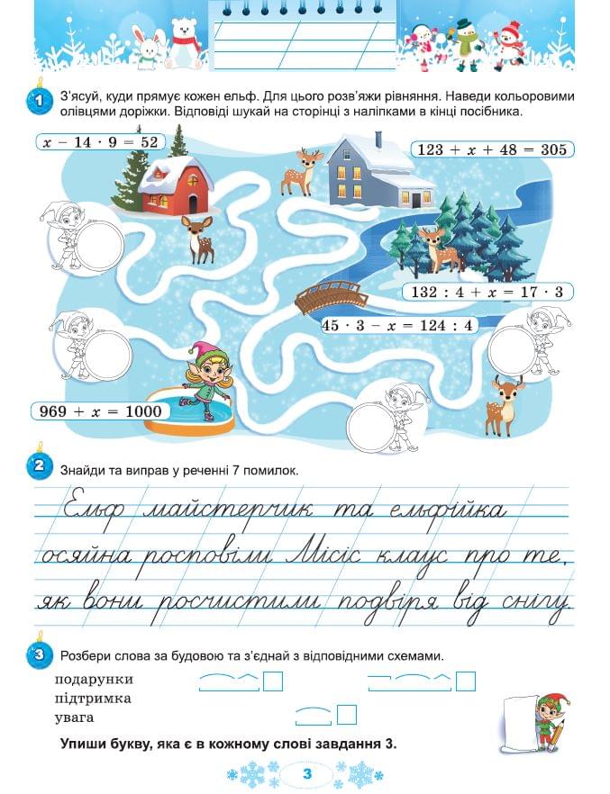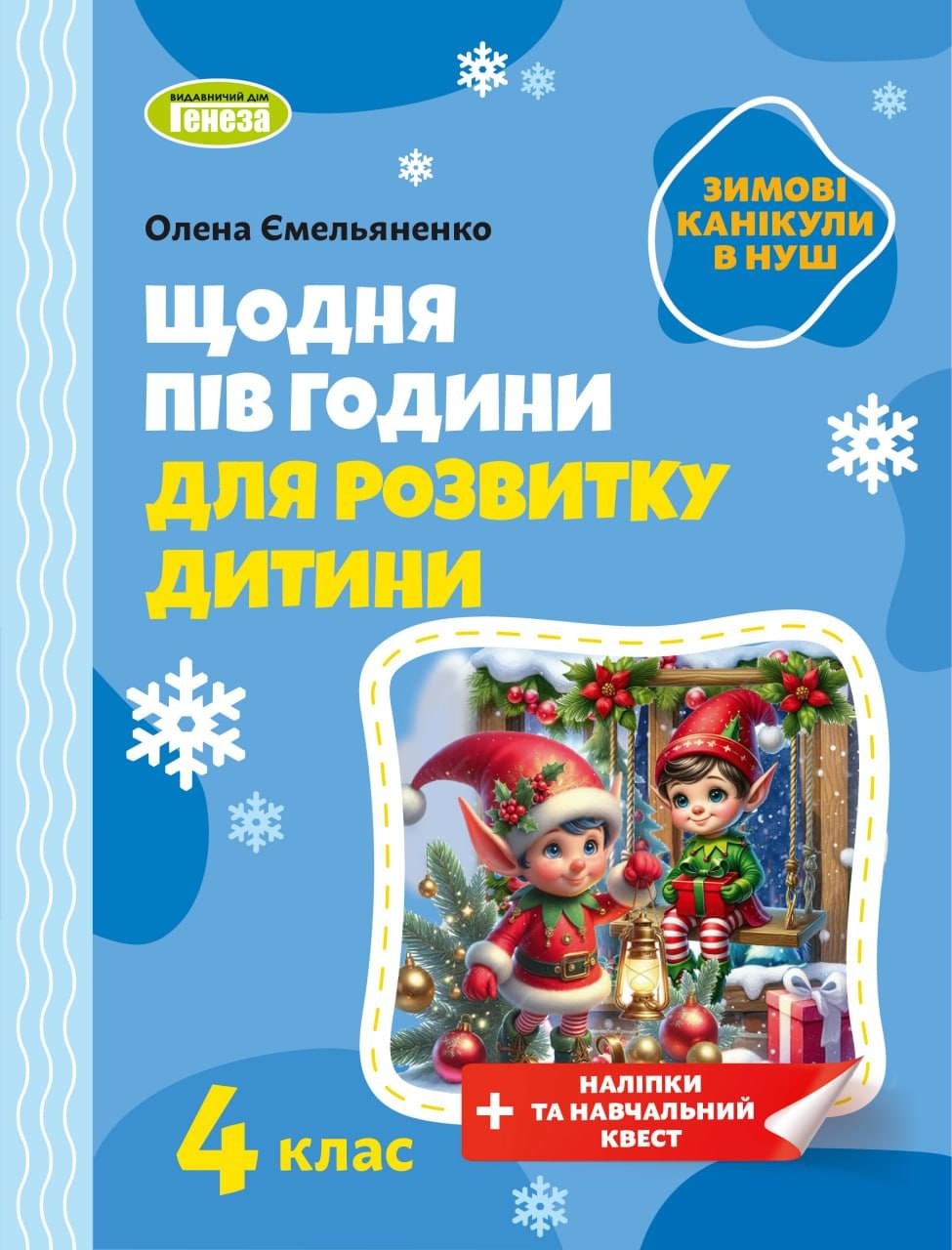 У посібнику запропоновано інтегровані завдання навчального та розвивального характеру у формі квесту, які відповідають концепції Нової української школи й освітній програмі для 4 класу. Провідні персонажі - різдвяні ельфи - допоможуть школярам весело, цікаво та змістовно провести зимові канікули, поєднати відпочинок з інтелектуальним розвитком, повторити вивчений матеріал та підготуватися до наступного навчального семестру. Завдання посібника розраховані на щоденну роботу впродовж зимових канікул.