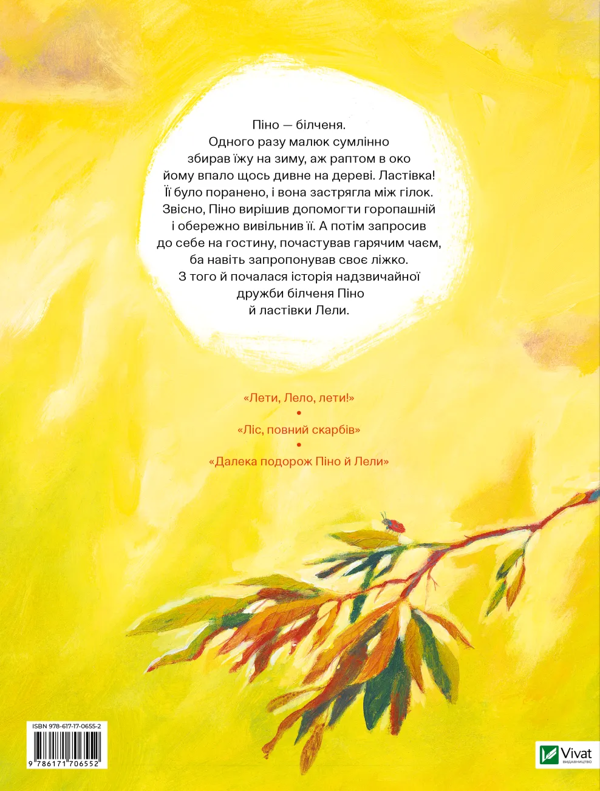 Піно — білченя. Одного разу малюк сумлінно збирав їжу на зиму, аж раптом в око йому впало щось дивне на дереві. Ластівка! Її було поранено, і вона застрягла між гілок. Звісно, Піно вирішив допомогти горопашній і обережно вивільнив її. А потім запросив до себе на гостину, почастував гарячим чаєм, ба навіть запропонував своє ліжко. З того й почалася історія надзвичайної дружби білченя Піно й ластівки Лели.