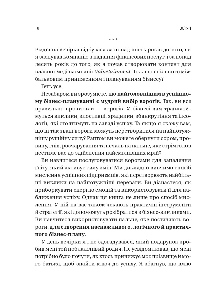 Ви знаєте, хто ваші конкуренти, регулярно стежите за ними й можете перерахувати їхні сильні й слабкі сторони. Але вороги — це зовсім інше. Вони ненавидять, сумніваються, кажуть, що у вас нічого не вийде, руйнують ваші мрії. Коли думаєте про ворогів, ви сповнюєтеся емоціями й упевненістю, що вас не зупинити. Це допомагає прискорити розвиток бізнесу, лідерувати вже зараз і твердо ставати на ноги в майбутньому. Але обирати ворогів потрібно мудро, з розумінням: