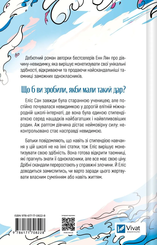 Еліс Сан завжди була старанною ученицею, але постійно почувалася невидимкою у дорогій елітній міжнародній школі-інтернаті, де вона була єдиною стипендіаткою серед нащадків найбагатших і найвпливовіших родин. Аж раптом дівчина дістає неймовірну силу: неконтрольовано стає насправді невидимою. Що б ви зробили, якби мали такий дар?