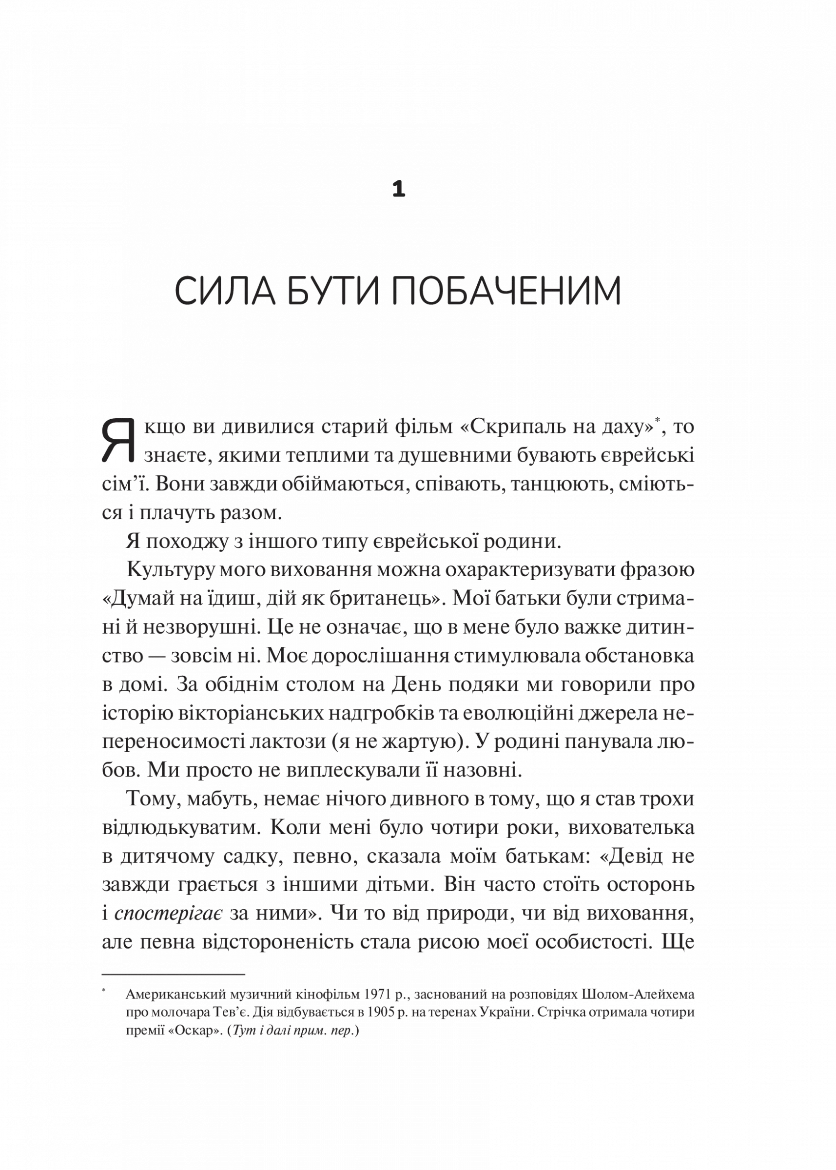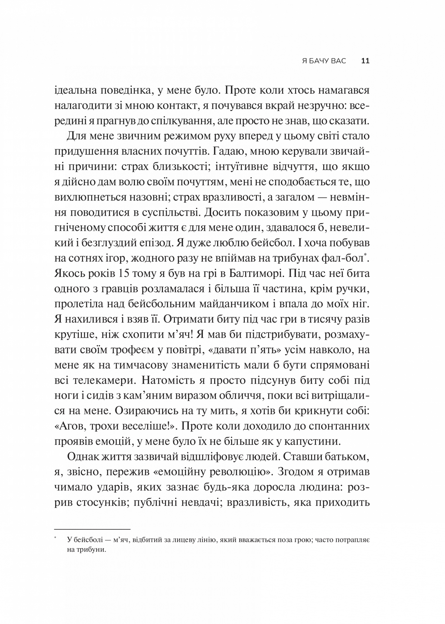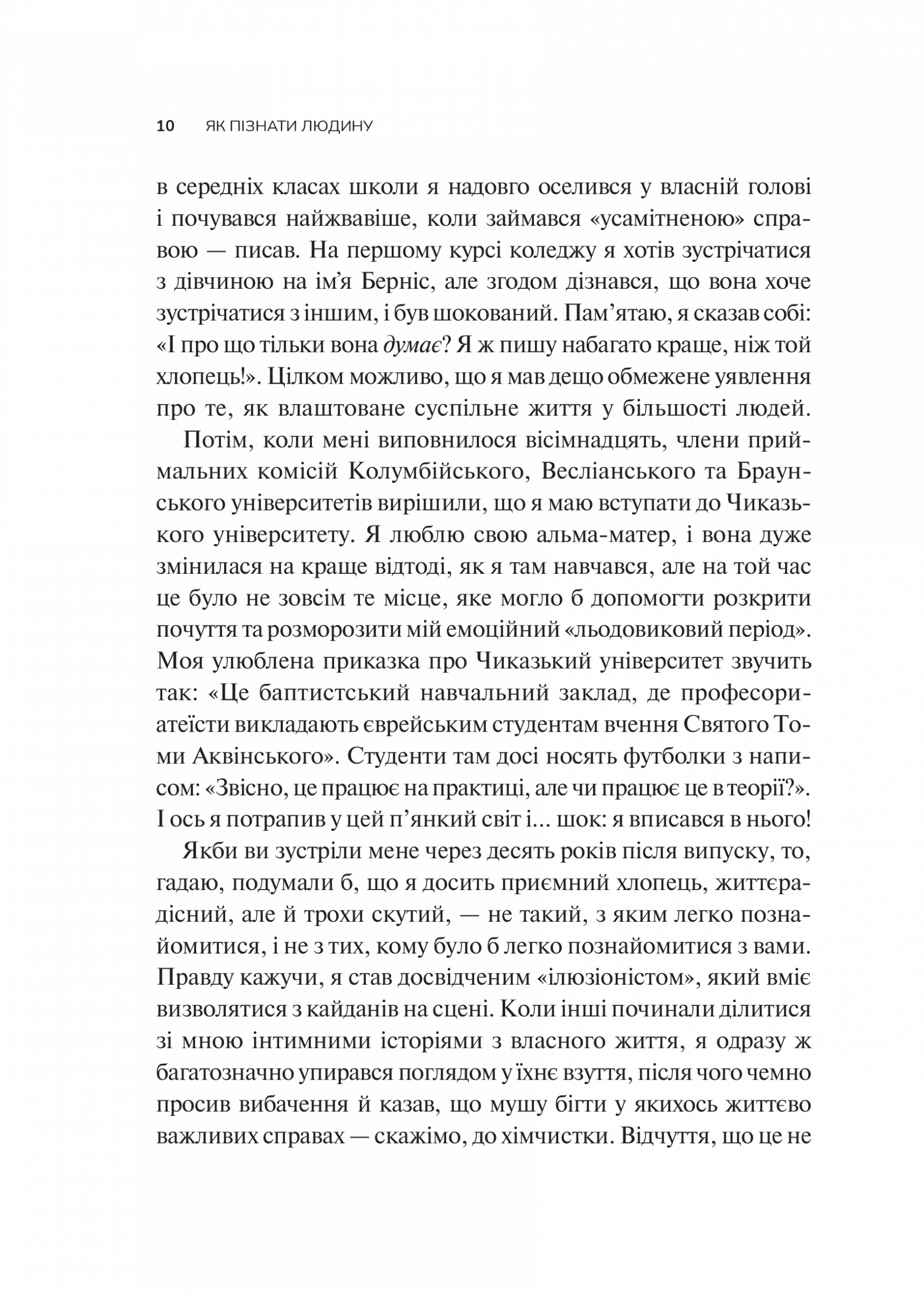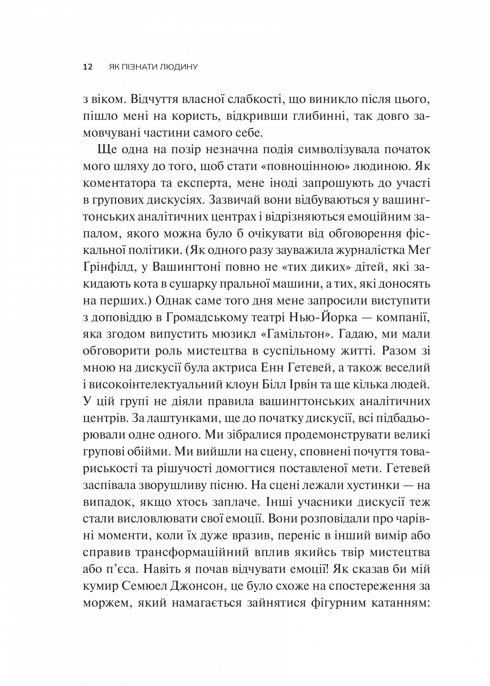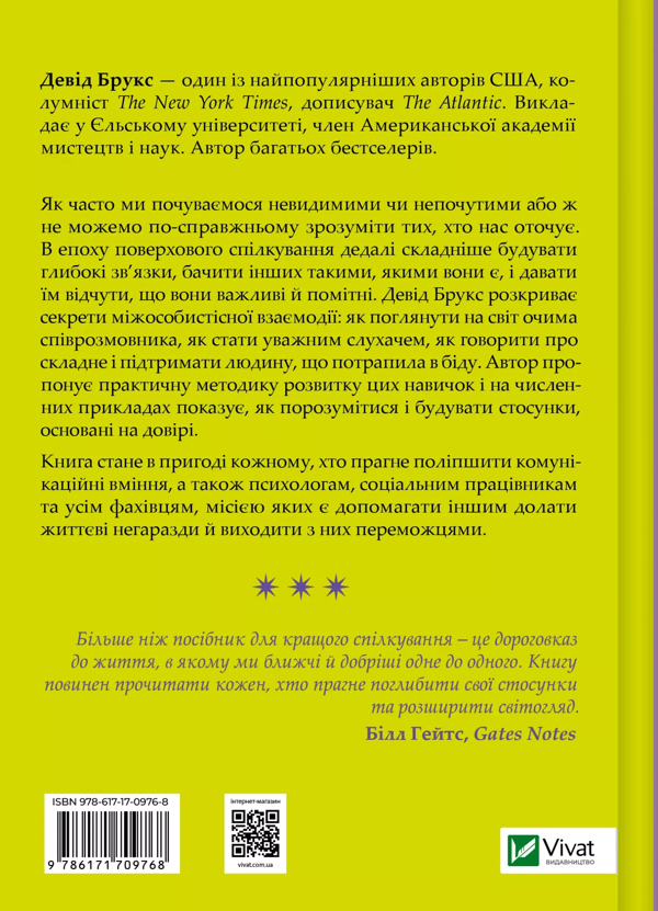 Як часто ми почуваємося невидимими чи непочутими або ж не можемо по-справжньому зрозуміти тих, хто нас оточує. В епоху поверхового спілкування дедалі складніше будувати глибокі зв’язки, бачити інших такими, якими вони є, і давати їм відчути, що вони важливі й помітні. Девід Брукс розкриває секрети міжособистісної взаємодії: як поглянути очима співрозмовника, як стати уважним слухачем, як говорити про складне і підтримати людину, що потрапила в біду. Автор пропонує практичну методику розвитку цих навичок і на численних прикладах показує, як порозумітися і будувати стосунки, основані на довірі.