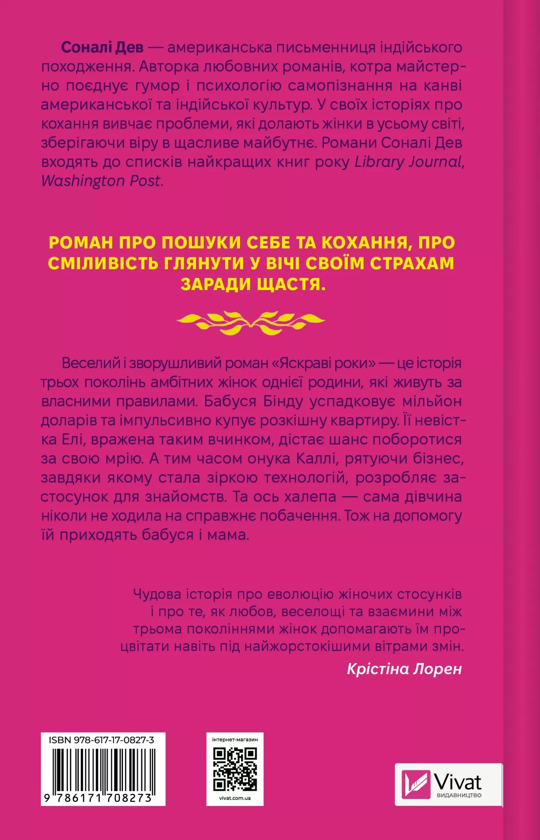 Веселий і зворушливий роман «Яскраві роки» — це історія трьох поколінь амбітних жінок однієї родини, які живуть за власними правилами. Бабуся Бінду успадковує мільйон доларів та імпульсивно купує розкішну квартиру. Її невістка Елі, вражена таким вчинком, дістає шанс поборотися за свою мрію. А тим часом онука Каллі, рятуючи бізнес, завдяки якому стала зіркою технологій, розробляє застосунок для знайомств. Та ось халепа — сама дівчина ніколи не ходила на справжнє побачення. Тож на допомогу їй приходять бабуся і мама.