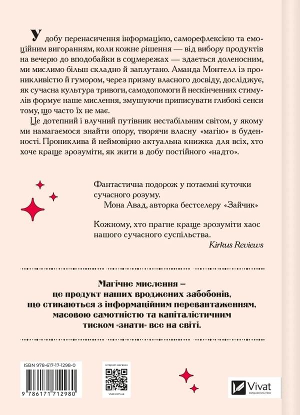 У добу перенасичення інформацією, саморефлексією та емоційним вигоранням, коли кожне рішення — від вибору продуктів на вечерю до вподобайки в соцмережах — здається доленосним, ми мислимо більш складно й заплутано. Аманда Монтелл із проникливістю й гумором, через призму власного досвіду, досліджує, як сучасна культура тривоги, самодопомоги й нескінченних стимулів формує наше мислення, змушуючи приписувати глибокі сенси тому, що часто їх не має.
