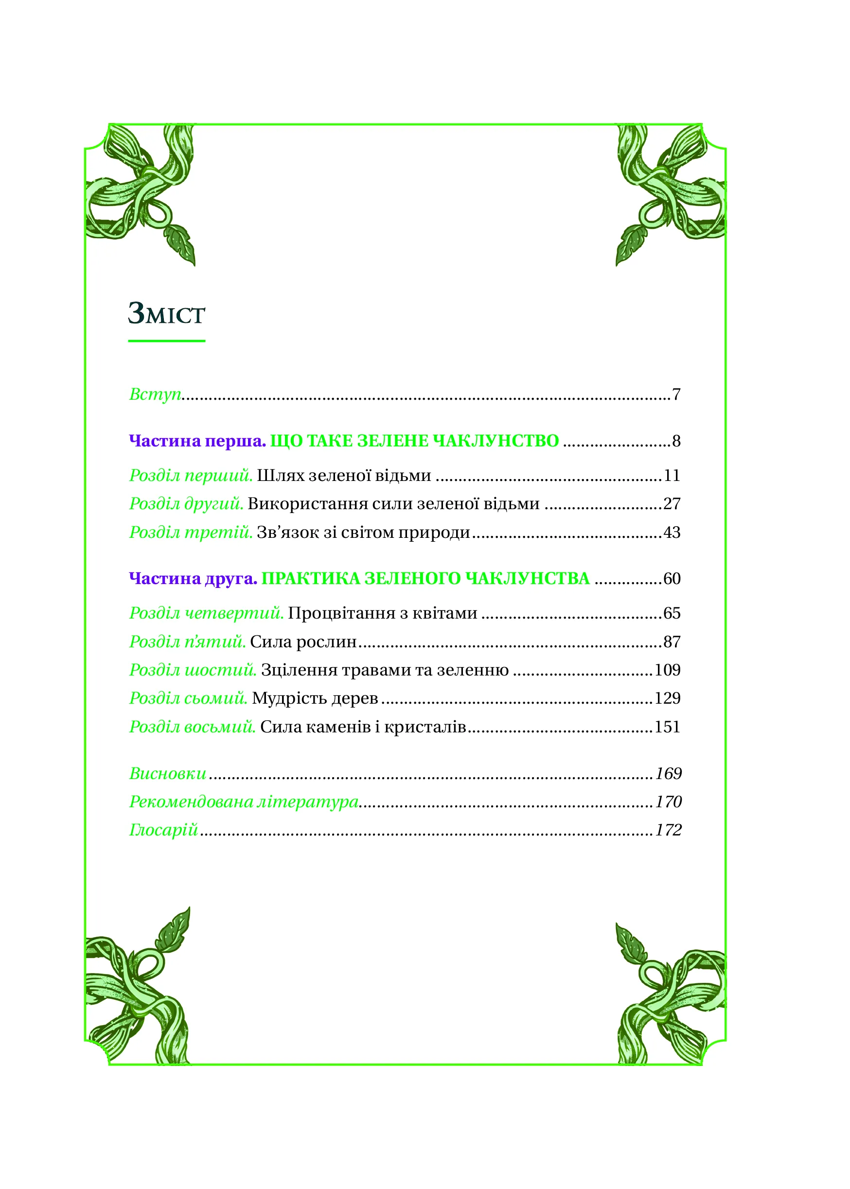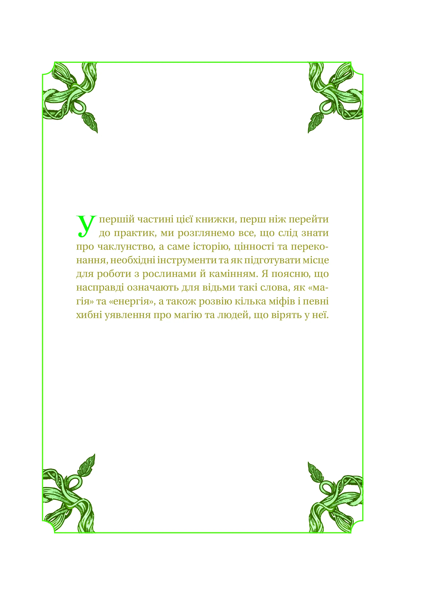У ваших руках практичний посібник із зеленого чаклунства, який допоможе встановити або посилити зв’язок із рослинами, квітами та камінням. Бо що більше ви віддаєте землі, то більше від неї натомість отримуєте. І вам не треба відмовлятися від своїх принципів і вподобань: віри в науку, медицину, Бога, життя у великому місті чи ділового костюма. Магія — це природна енергія уяви, натхнення та інтуїції, яка живить ваші мрії та прагнення. Тож ваше завдання — навчитися використовувати цю енергію собі на користь. Вам знадобляться кілька перевірених відьомською спільнотою заклинань, кристали, нескладні інструменти та трішки допитливості. І пам’ятайте: будь-хто може стати зеленою відьмою або зеленим відьмаком.