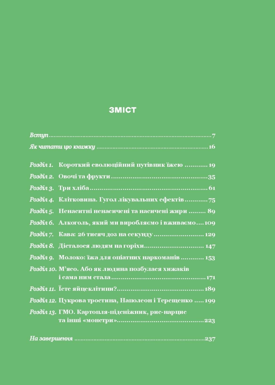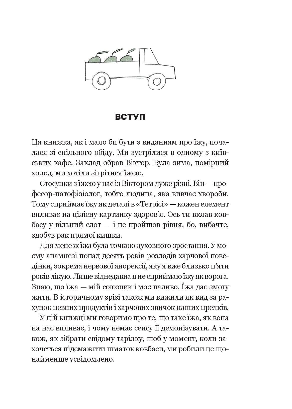 Ця книжка — розмова професора-патофізіолога, який понад двадцять років досліджує хвороби, і редакторки, яка десять років жила з розладами харчової поведінки. Вони обговорили користь і шкоду для організму кожного продукту і «переклали» наукові обґрунтування простими словами.