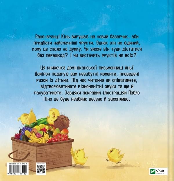 Ця книжечка домініканської письменниці Аньї Дамірон подарує вам незабутні моменти, проведені разом із дітьми. Під час читання ви співатимете, відтворюватимете різноманітні звуки та ще йвідтворюватимете різноманітні звуки та ще й рахуватимете. Завдяки яскравим ілюстраціям Пабло Піно це буде неабияк весело й захопливо.