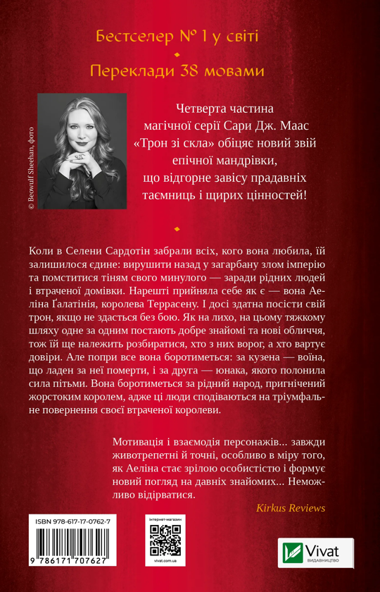 Коли в Селени Сардотін забрали всіх, кого вона любила, їй залишилося єдине: вирушити назад у загарбану злом імперію та помститися тіням свого минулого — заради рідних людей і втраченої домівки. Нарешті прийняла себе як є — вона Аеліна Ґалатінія, королева Террасену. І досі здатна посісти свій трон, якщо не здасться без бою. Як на лихо, на цьому тяжкому шляху одне за одним постають добре знайомі та нові обличчя, тож їй ще належить розбиратися, хто з них ворог, а хто вартує довіри. Але попри все вона боротиметься: за кузена — воїна, що ладен за неї померти, і за друга — юнака, якого полонила сила пітьми. Вона боротиметься за рідний народ, пригнічений жорстоким королем, адже ці люди сподіваються на тріумфальне повернення своєї втраченої королеви.
