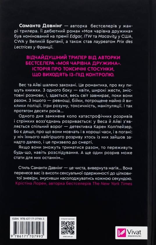 Одного дня замкнене коло катастрофічних розривів і стрімких возз’єднань розривається: у Веса й Айві з’являється спільний ворог — детективка Карен Колґлейзер. Бо є дещо, про що вони мовчать і в хороші часи, і в погані: у ніч їхнього найгіршого розриву хтось із них зайшов занадто далеко, і це призвело до смерті.