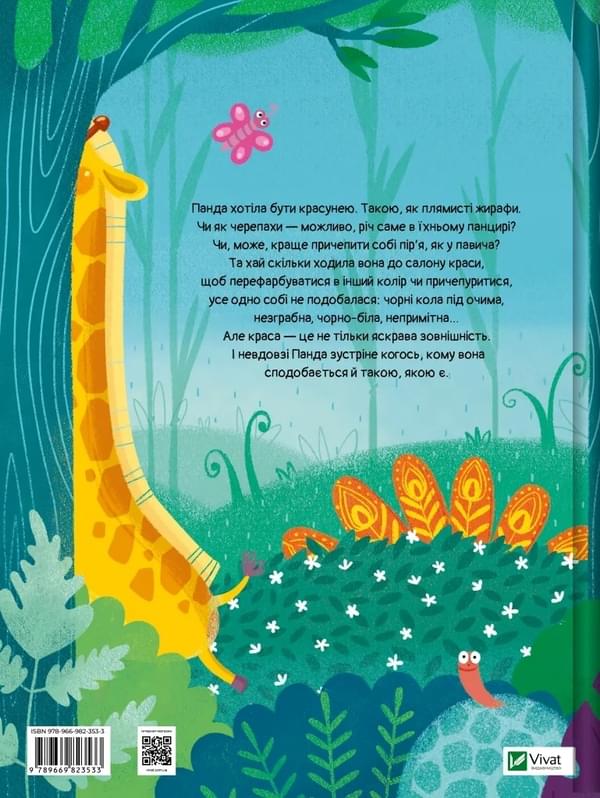 Панда хотіла бути красунею. Такою, як плямисті жирафи. Чи як черепахи — можливо, річ саме в їхньому панцирі? Чи, може, краще причепити собі пір’я, як у павича?