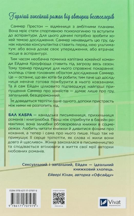 Саммер Престон — відмінниця з амбітними планами. Вона мріє стати спортивною психологинею та вступити до аспірантури. Для цього дівчині потрібно зробити хокей темою дослідження. Саммер ненавидить цю гру, однак наукова консультантка ставить перед нею ультиматум: або вона долає своє упередження, або втрачає місце в аспірантурі. Тим часом необачна помилка капітана хокейної команди Ейдена Кроуфорда ставить під загрозу весь сезон. Тому тренер придумує для нього справжнє покарання: хлопець стане головним об’єктом дослідження Саммер. Це — останнє, що він хотів би робити, тим паче що дослідниця неначе готова пожбурити в нього ковзанами. Та й сам Ейден цілковито підтверджує найгірші припущення Саммер про хокеїстів — думає лише про гру, запальний, безцеремонний. Їм доведеться терпіти одне одного, допоки пристрасть між ними не розтопить лід.