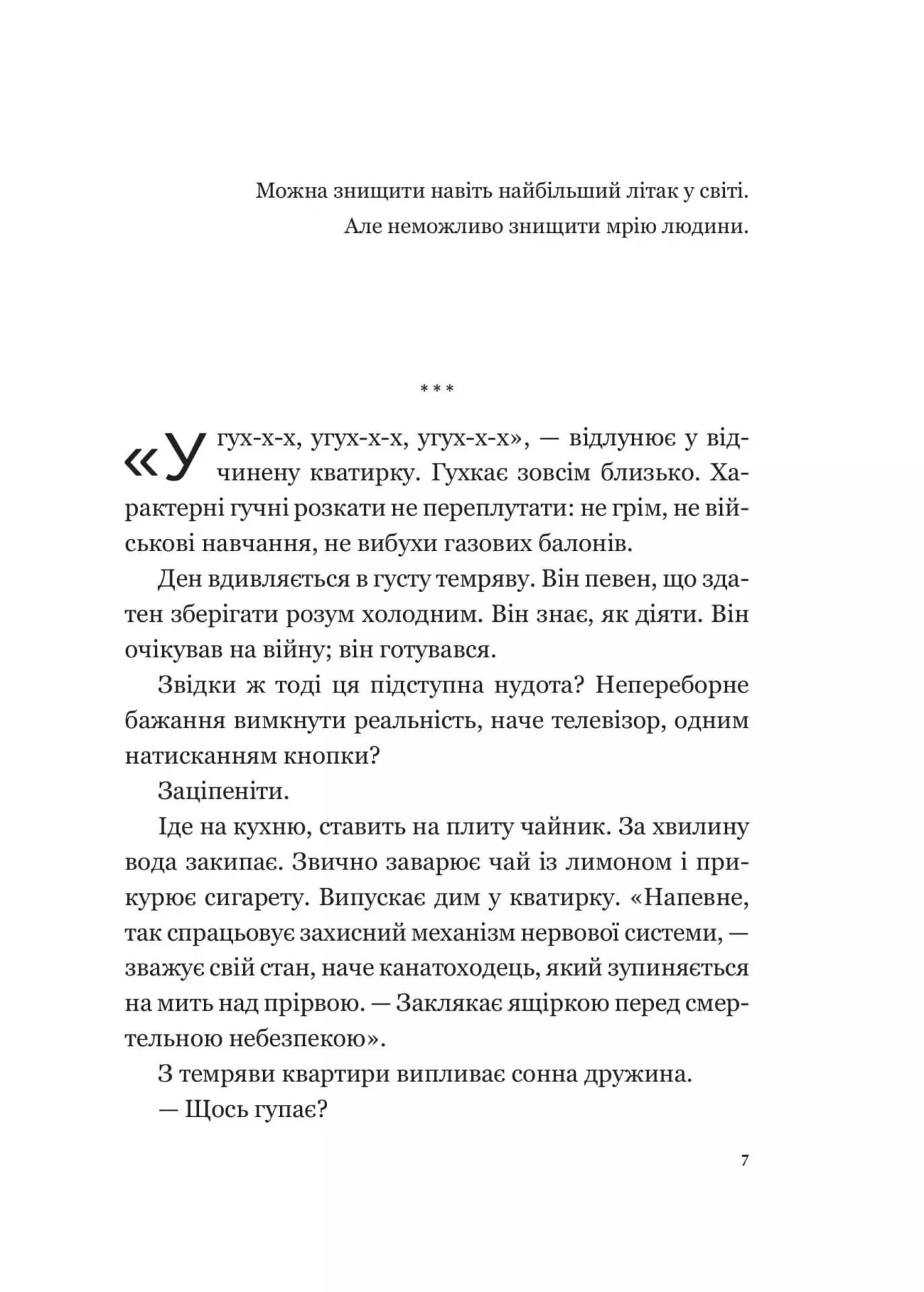 Це роман не лише про перші тижні повномасштабного вторгнення та знищення «Мрії», найбільшого вантажного літака у світі. Це щемка історія про людей, які посеред пекла війни залишилися вірними людській сутності, протиставляючи жорстокості й насильству взаємодопомогу та емпатію.