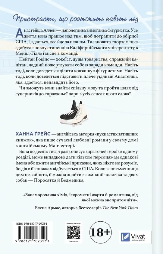 Нейтан Гокінс — хокеїст, душа товариства, справжній капітан, ладний пожертвувати собою заради команди. Навіть тоді, коли доведеться ділити ковзанку з фігуристами. Навіть тоді, коли доведеться підставити плече уїдливій Анастейші, яка, здається, ненавидить його.