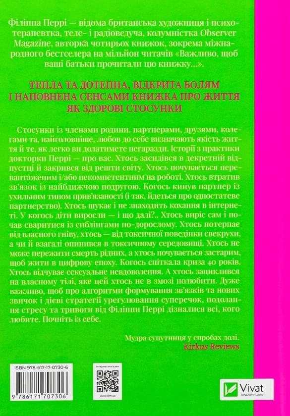 Стосунки із членами родини, партнерами, друзями, колегами та, найголовніше, любов до себе визначають якість життя й те, як легко ви долатимете негаразди. Історії з практики докторки Перрі — про вас. Хтось засидівся в декретній відпустці й закрився від решти світу. Хтось почувається перевантаженим і/або некомпетентним на роботі. Хтось втратив зв’язок із найближчою подругою. Когось кинув партнер із ухильним типом прив’язаності (і так, йдеться про одностатеве партнерство). Хтось шукає і не знаходить кохання в інтернеті. У когось діти виросли — і що далі?.. Хтось виріс сам і почав сваритися із сиблінгами по-дорослому. Хтось потерпає від власного гніву, хтось — від токсичної поведінки свекрухи, а чи й взагалі опинився в токсичному середовищі. Хтось не може пережити смерть рідних, а хтось почувається застарим, щоб жити в цифрову епоху. Когось спіткала криза 40 років. Хтось відчуває сексуальне невдоволення. А хтось зациклився на власному тілі, яке цей хтось не в змозі полюбити. Дуже важливо, щоб про алгоритми формування зв’язків та нових звичок і дієві стратегії урегулювання суперечок, подолання стресу та тривоги від Філіппи Перрі дізналися всі, кого любите. Почніть із себе.