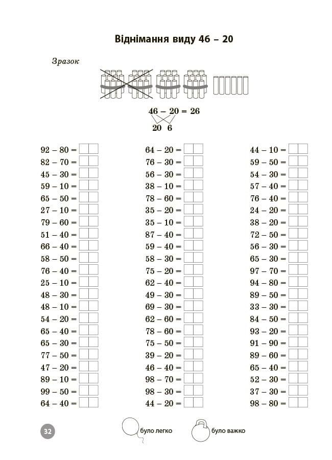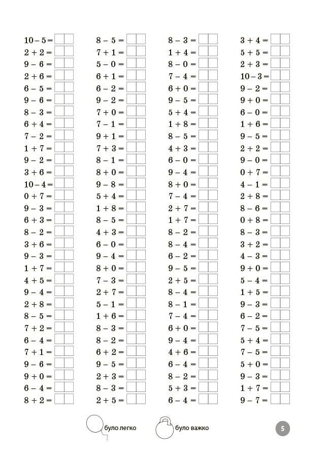 У посібнику наведено умовні позначки, за допомогою яких учні можуть оцінити свої уміння після виконання завдань: було важко або було легко. Посібник стане в пригоді як для самостійної роботи, так і для використання на уроках математики.