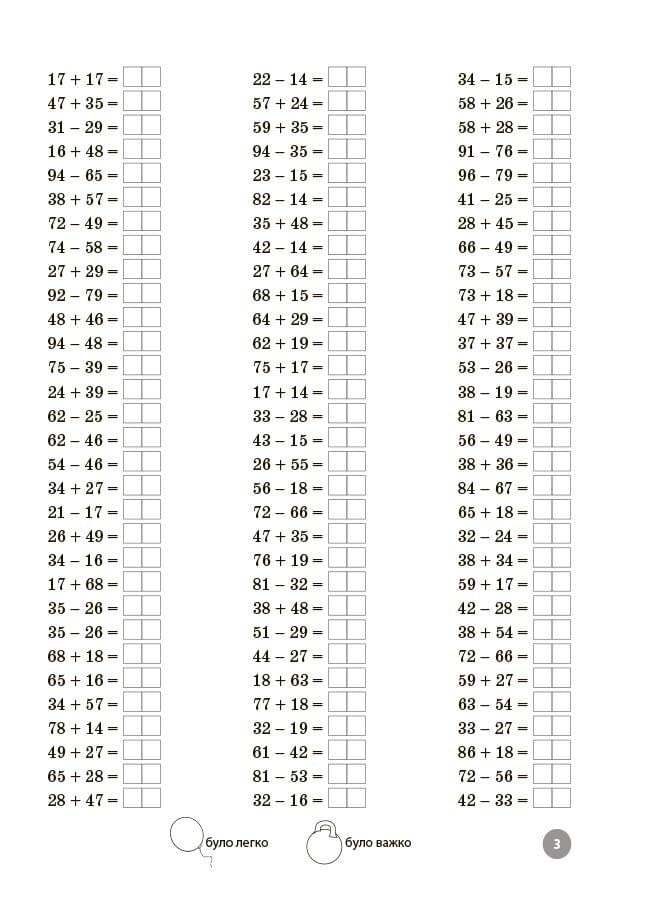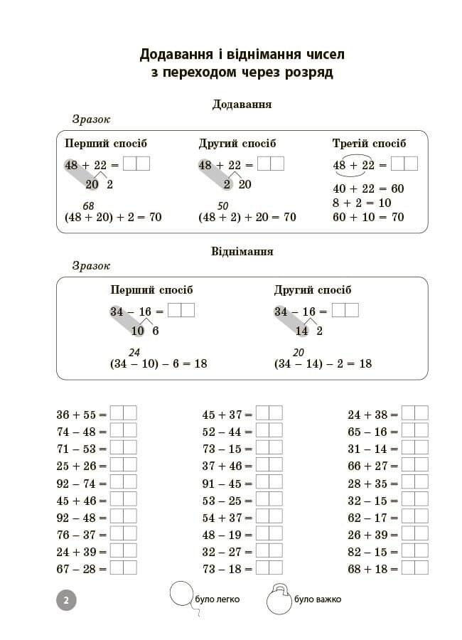 У посібнику наведено умовні позначки, за допомогою яких учні можуть оцінити свої уміння після виконання завдань: було важко або було легко. Універсальний посібник стане в пригоді як для самостійної роботи, так і для використання на уроках математики, сприяючи розвитку логічного мислення, уваги та швидкості обчислень.
