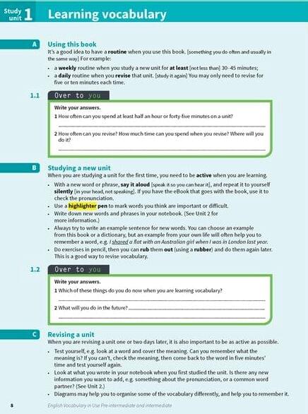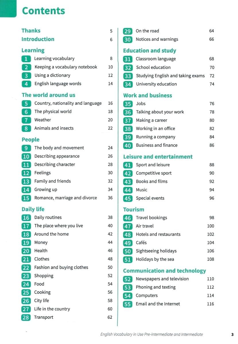 Цей курс англійської мови English Vocabulary in Use призначений для учнів зі знанням мови на рівнях Pre-intermediate і Intermediate (В1). Він прекрасно підходить як для самостійного, так і для класного навчання. Учні зможуть збагатити словниковий запас. У цьому їм допоможуть зрозумілі тлумачення правил, практичні вправи та вивчення нових слів через контекст 100 тем, серед яких: «Бронювання в подорожах», «Кафе» та «Електронна пошта й інтернет». Завдяки дослідженням кембриджського університету про використання англійської мови в письмовому та усному мовленні, учні набувають упевненості в тому, що саме вони вивчають протягом курсу. Навчальні поради, додаткові завдання й відповіді до вправ допоможуть займатися самостійно й удосконалювати власні знання.