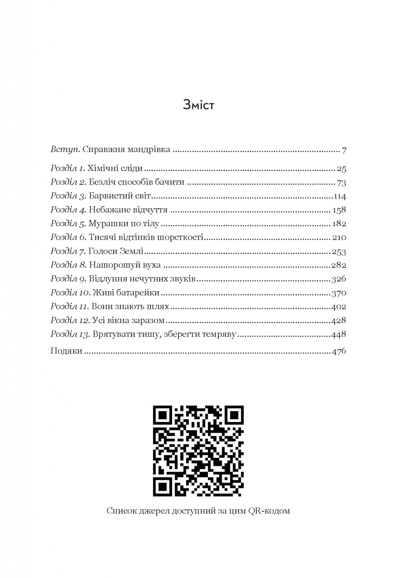 Ви зустрінете жуків, яких приваблює дим, та морських черепах, здатних відчувати магнітні поля Землі. Дізнаєтеся, що крокодили виявляють найменші брижі на поверхні води, та що очі гігантського кальмара еволюціонували, щоб бачити китів; що рослини гудуть тихими вібраційними піснями, і що навіть прості морські гребінці мають складний зір. Довідаєтеся, що бачать бджоли у квітах, що чують співочі птахи у своїх мелодіях і що винюхують собаки на вулиці.