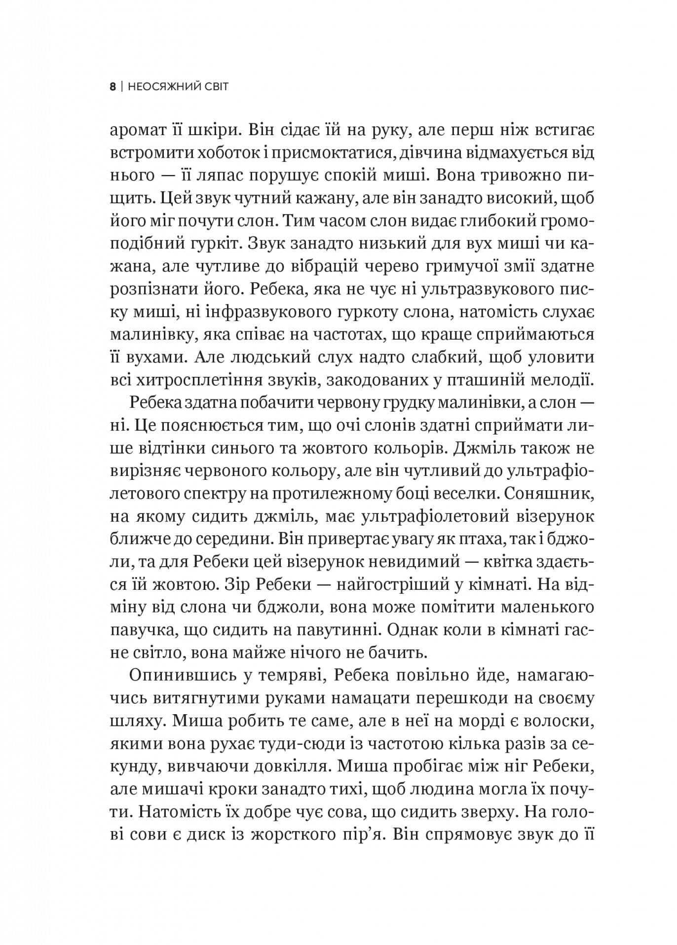 Як тварини використовують свої органи чуття? Нюх і смак? Дотики, вібрацію, слух? А як вони бачать? Який їхній світ кольорів? Автор допомагає зазирнути всередину видосвітів тварин і відкрити чимало таємниць.