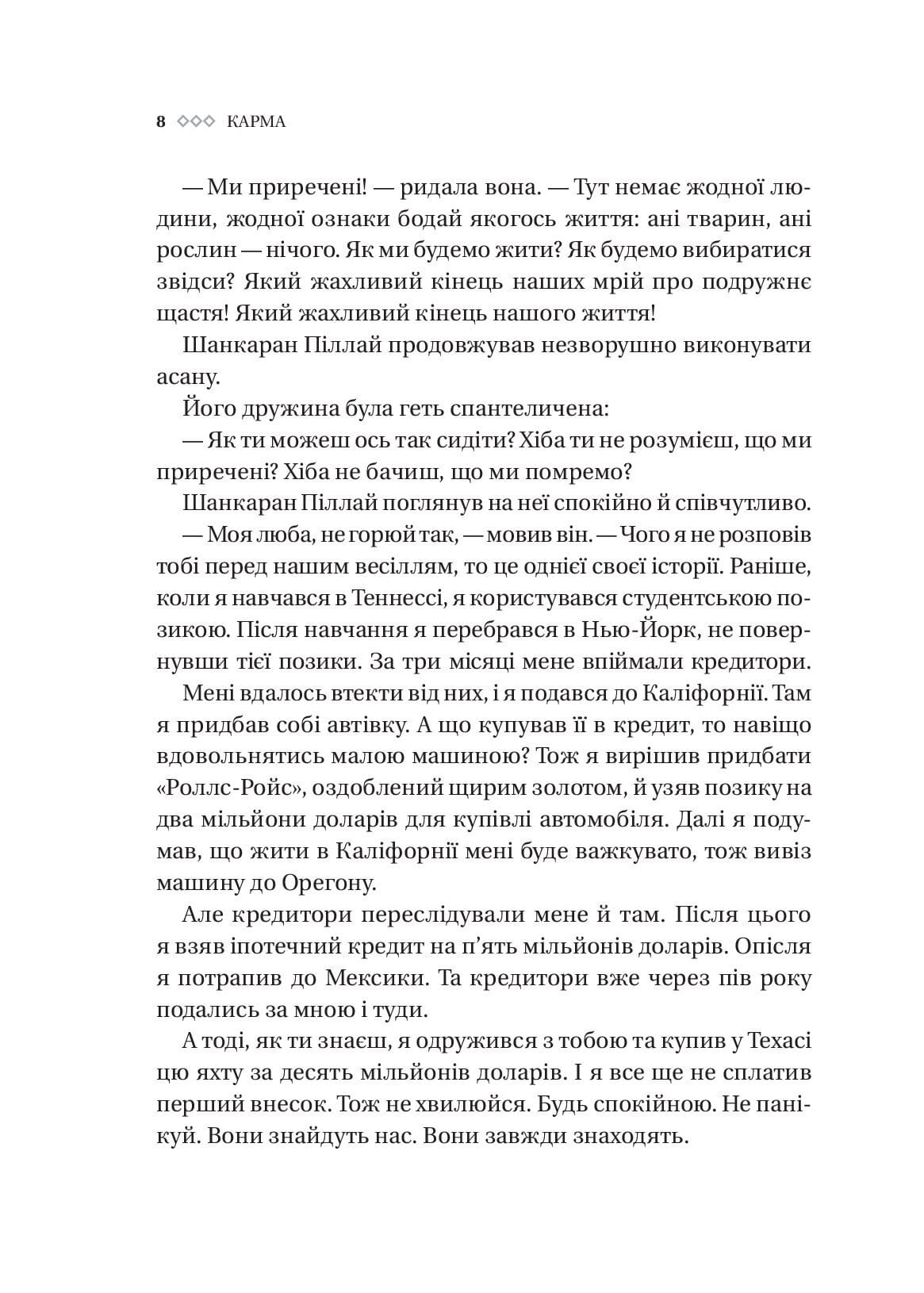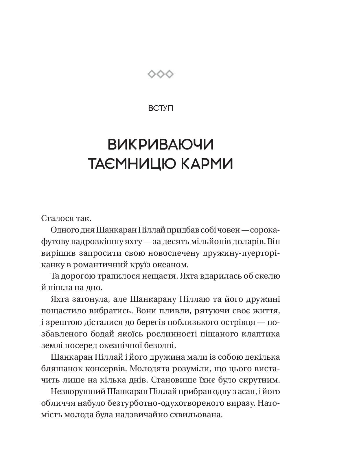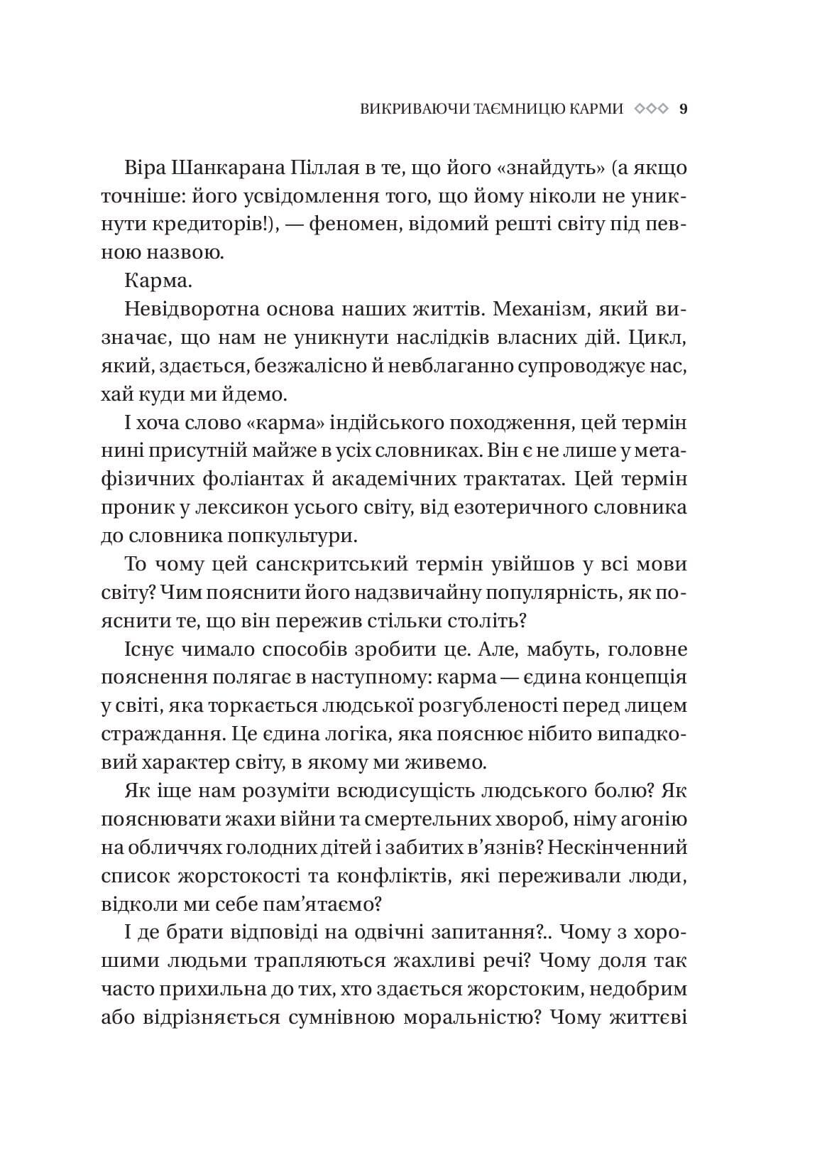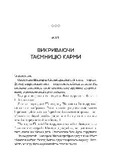 Іноді, коли з хорошими людьми трапляються погані речі, навколо відбувається щось жахливе, а ми збентежено намагаємося знайти відповіді, у голові виринає слово «карма». Цей санскритський термін проник у лексикон різних мов, глибоко закоренився як в езотериці, так і в попкультурі. Його можна почути від дітей і дорослих, від представників будь-яких професій на всіх континентах. На думку багатьох людей, карма — це баланс добрих і поганих вчинків, чеснот і гріхів, механізм, зав’язаний на неможливості уникнути наслідків власних дій. Насправді карма не має нічого спільного з винагородою чи покаранням. Карма — єдина логіка, що пояснює нібито випадковий характер подій у світі, в якому ми живемо, це внутрішній цикл, створений самими людьми, і він базується на наших діях і відповідальності. «Карма» Садхґуру — це водночас дослідження і путівник шляхами до радісного, свідомого та змістовного буття, книга, яка допомагає взятися за кермо власної долі й самотужки керувати своїм життям.