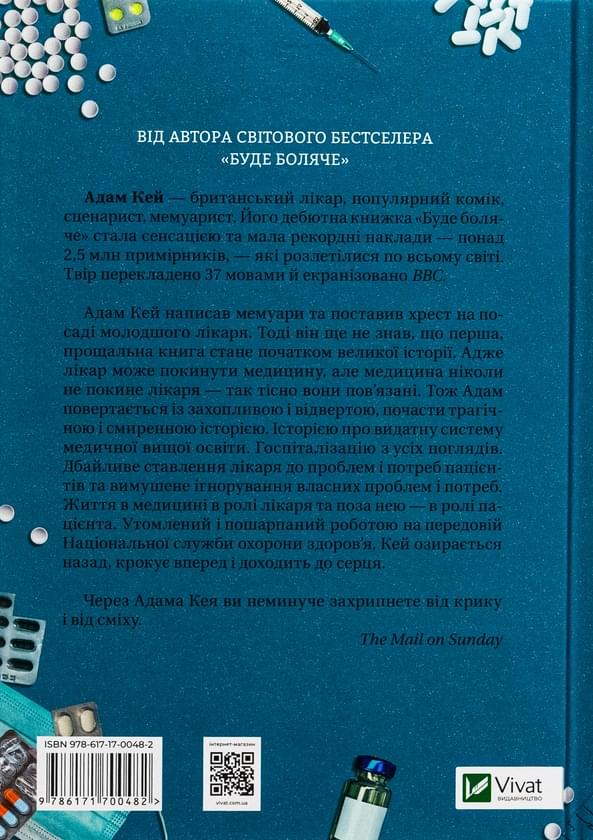 Адам Кей написав мемуари та поставив хрест на посаді молодшого лікаря. Тоді він ще не знав, що перша, прощальна книжка стане початком великої історії. Адже лікар може покинути медицину, але медицина ніколи не покине лікаря — так тісно вони пов'язані. Тож Адам повертається із захопливою і відвертою, почасти трагічною і смиренною історією. Історією про видатну систему медичної вищої освіти. Госпіталізацію з усіх поглядів. Дбайливе ставлення лікаря до проблем і потреб пацієнтів та вимушене ігнорування власних проблем і потреб. Життя в медицині в ролі лікаря та поза нею — в ролі пацієнта. Утомлений і пошарпаний роботою на передовій Національної служби охорони здоров'я, Кей озирається назад, крокує вперед і доходить до серця.