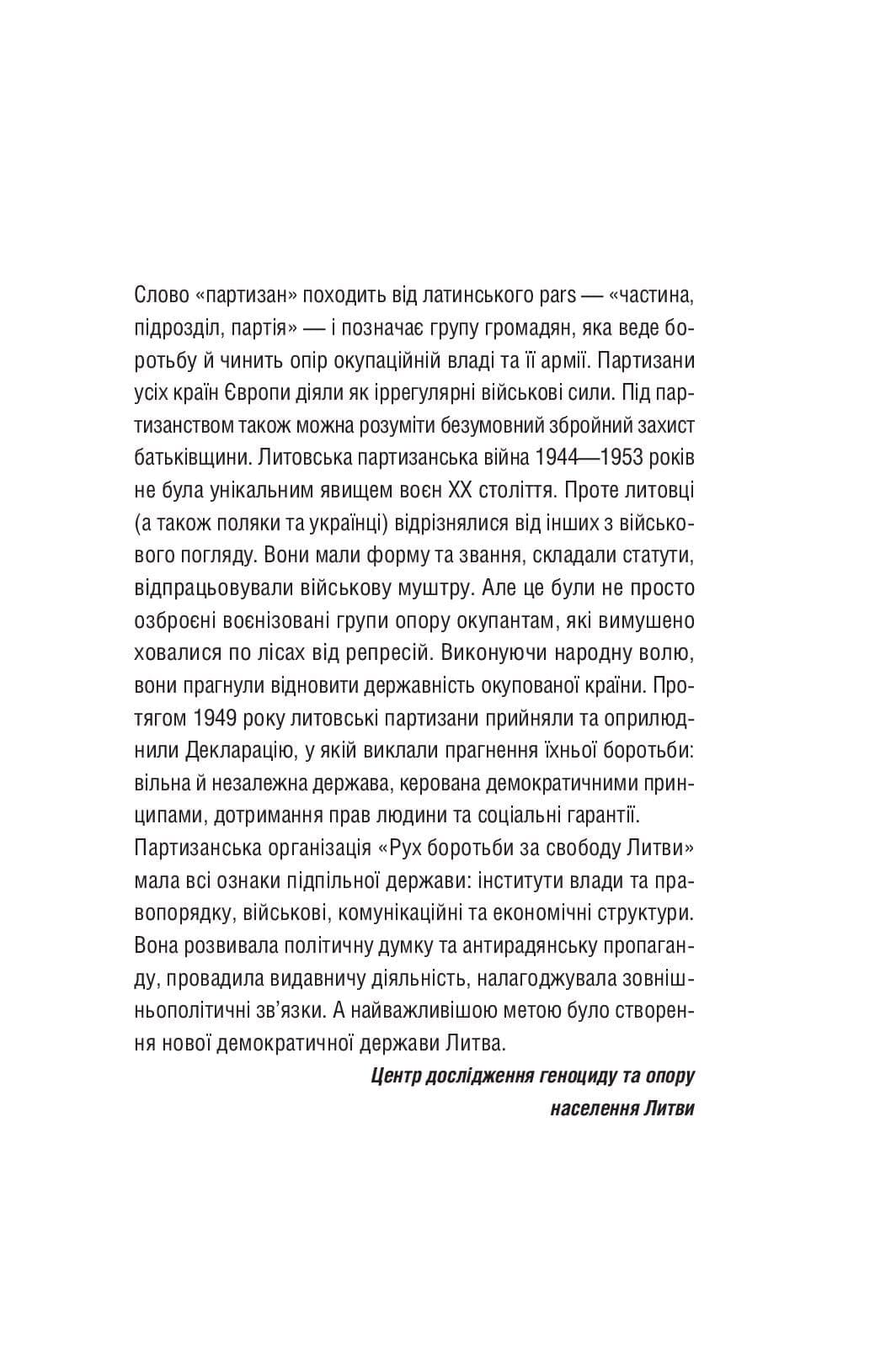 Литовські села змушені годувати армію окупанта. «Лісові брати» — так називають себе партизани, які стають регулярною армією підпільної литовської держави. Герої роману, Сакалас, Лютас, Тарзанас, Ажуолас, Шарунас і українець Іван Мартинюк, названий Йонасом, являють читачам колективний портрет повстанців, що кинули виклик російській окупаційній владі. Вони раз по раз доводять: всесильна радянська держбезпека на чужій землі може виявитися безсилою…