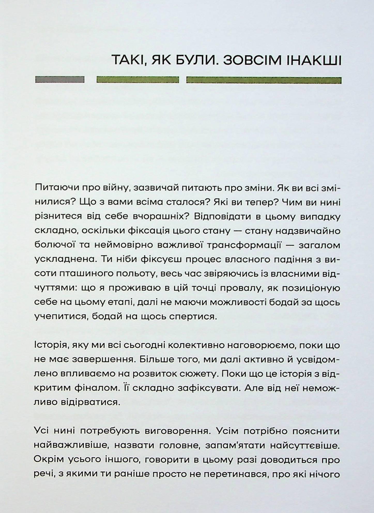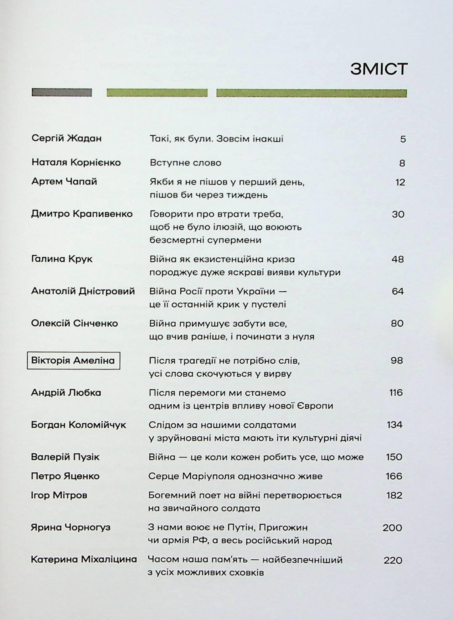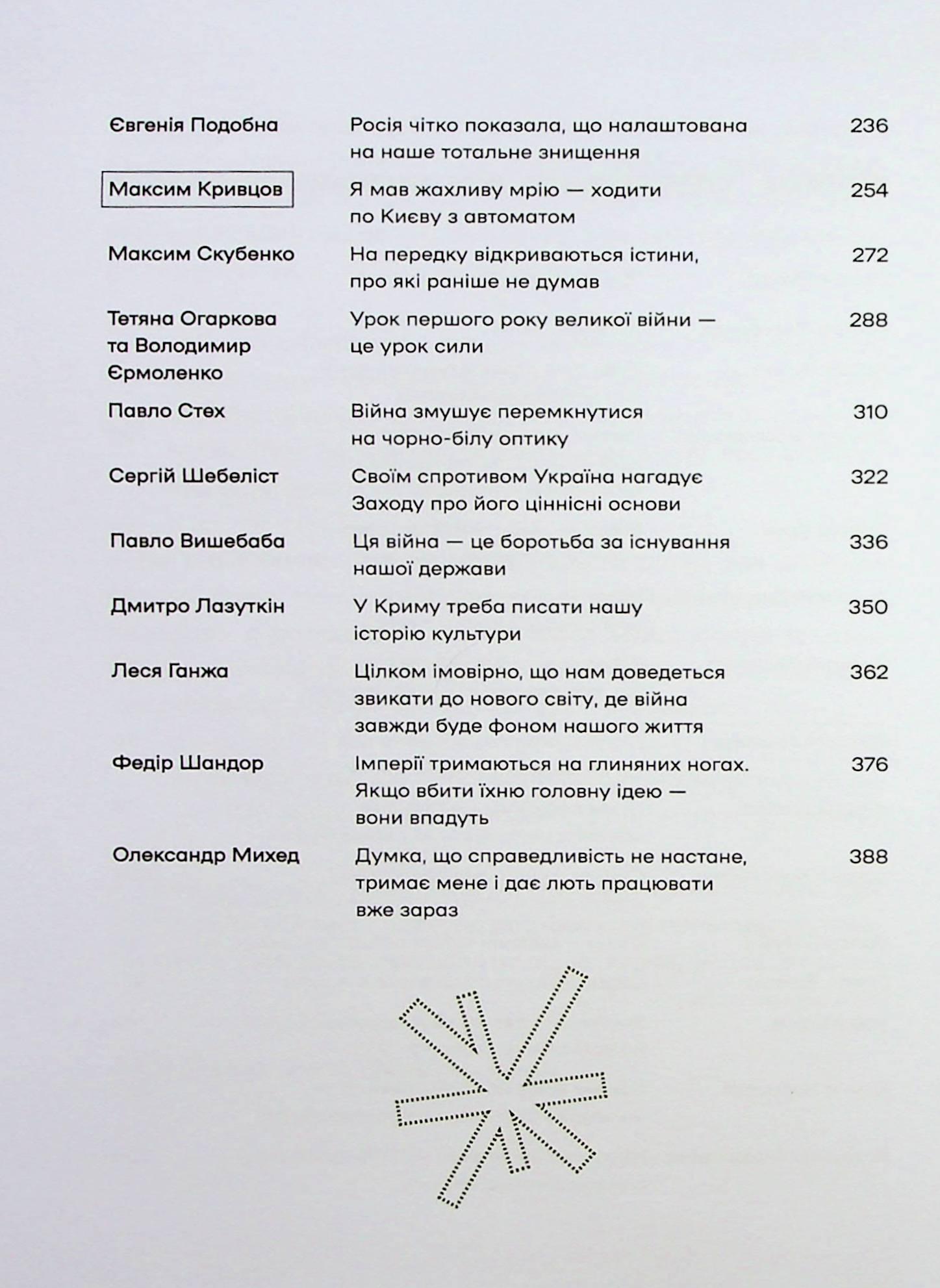 До книжки входить 24 інтервʼю: Артем Чапай, Дмитро Крапивенко, Галина Крук, Анатолій Дністровий, Олексій Сінченко, Вікторія Амеліна, Андрій Любка, Богдан Коломійчук, Валерій Пузік, Петро Яценко, Ігор Мітров, Ярина Чорногуз, Катерина Міхаліцина, Євгенія Подобна, Максим Кривцов, Максим Скубенко, Тетяна Огаркова та Володимир Єрмоленко, Павло Стех, Сергій Шебеліст , Павло Вишебаба, Дмитро Лазуткін , Леся Ганжа, Федір Шандор, Олександр Михед.