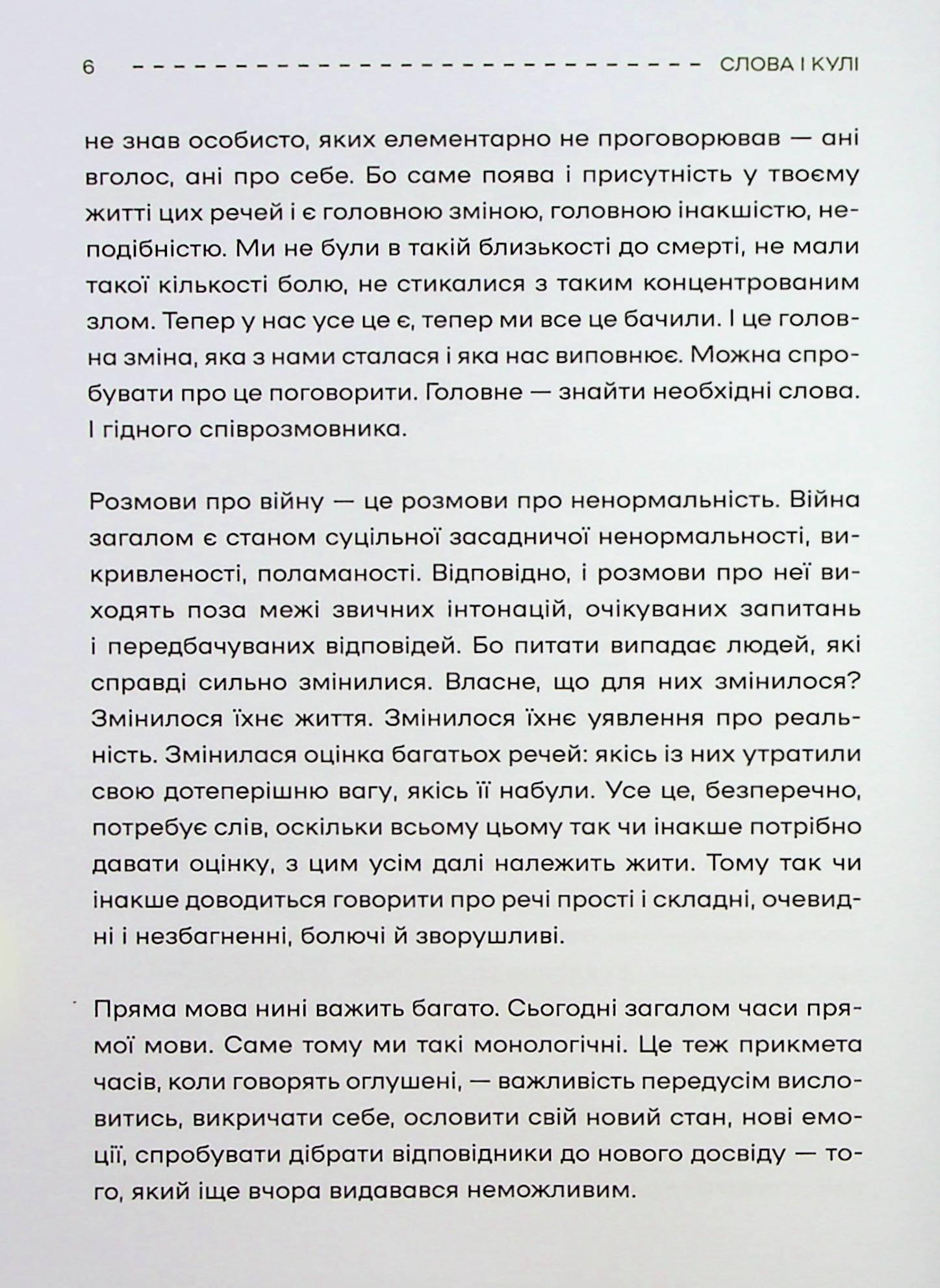 «Слова і кулі» — це розмови з людьми, які роками творили український літературний процес і розвивали українську журналістику, а тепер перетворилися з оповідачів на суб’єктів історій – тих, хто оберігає наше теперішнє й робить можливим наше майбутнє.