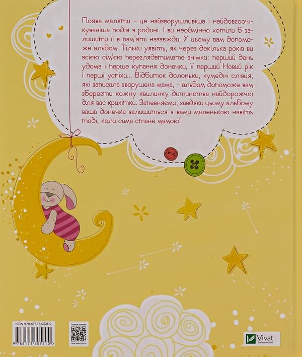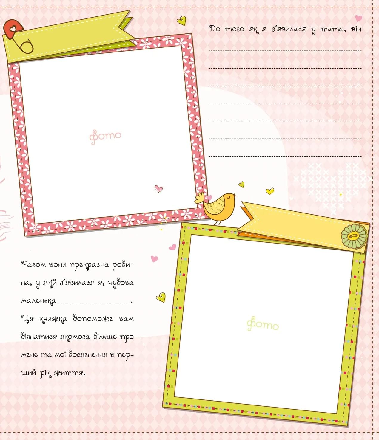 Поява маляти — це найзворушливіша і найдовгоочікуваніша подія в родині. Хіба ви не хотіли б залишити її у пам’яті назавжди? У цьому вам допоможе альбом. Тіль- ки уявіть, як через декілька років ви всією сім’єю переглядатимете знімки — перший день вдома і перше купання донечки, її перший Новий рік і перші успіхи... Відбиток маленької долоньки, кумедні слівця — альбом допоможе вам зберегти кожну хвилинку дитинства найдорожчої для вас людини. Запевняємо, завдяки цьому альбому ваша крихітка залишиться з вами навіть тоді, коли сама стане мамою!