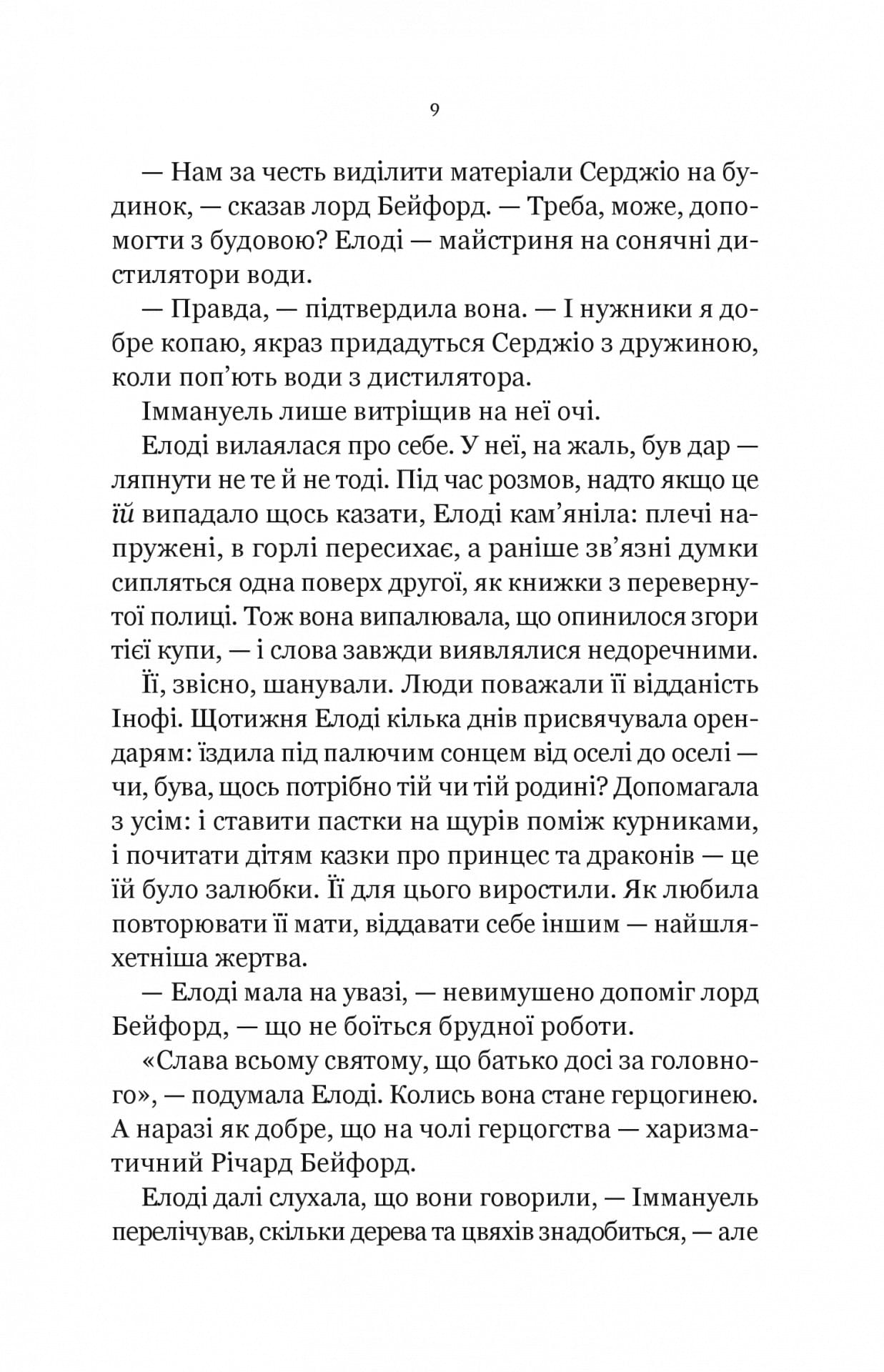 Елоді, донька лорда Бейфорда, ніколи не прагнула залишити рідне герцогство Інофі, радше навпаки — була переконана, що її призначенням є всіляко допомагати своєму народові. Життя в їхньому краї непросте: клімат непередбачуваний, врожаї мізерні, а люди часто-густо потерпають від голоду. Тож коли батько повідомив доньку, що свататиме її за Генрі, принца з успішного та квітучого острова Аврея, в обмін на повні сховища цієї зими й кожну зиму опісля, вона погодилася. До того ж Елоді листувалася з Генрі та знає його як приємну й цікаву людину. А проте, щось не сходилося. Інофі отримає підтримку та провізію. Що натомість матиме Аврея? На жаль, Елоді про все дізнається, коли вже буде принцесою в земному раю, який цілком може стати смертельною пасткою. Тим паче, вона не перша дівиця, котра погодилася на таку на позір вигідну угоду з дивним гаслом: «Життя за життя. Кров за вогонь».