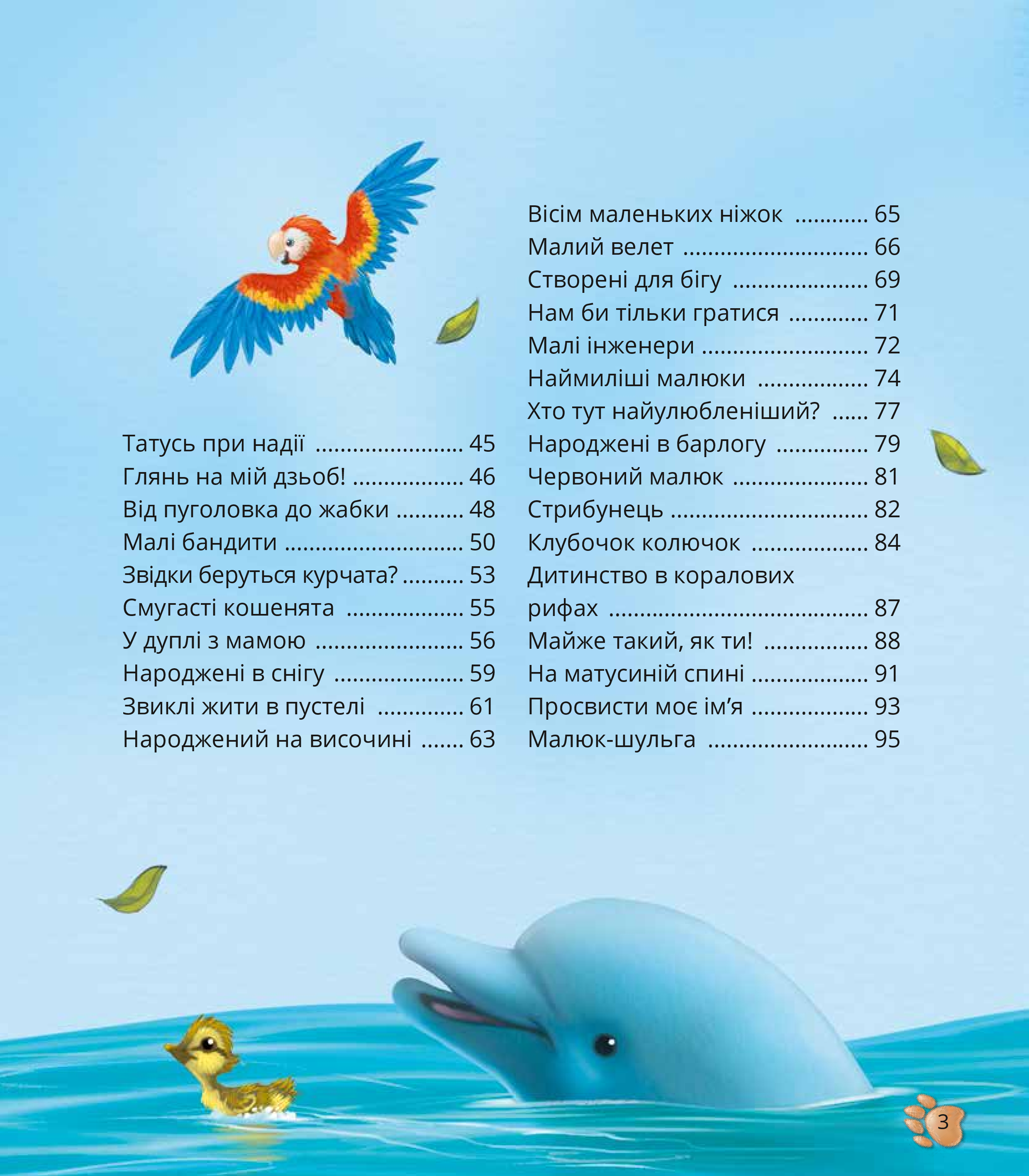 Ти подивись, які різні малята народжуються в світі тварин! Дехто з них — викапаний тато (або мама), а хтось геть не схожий на батьків. Одні приходять у цей світ серед криги, а інші вигулькують в океан. Є малі авантюристи, що з пелюшок досліджують усе навколо, а є домосидьки, які впродовж кількох років без мами й кроку ступити не можуть. Та всі ці малюки мають дещо спільне. Вони неймовірні! Кортить дізнатися про них докладніше? Тоді мерщій гортай цю книжку й милуйся яскравими малюнками!