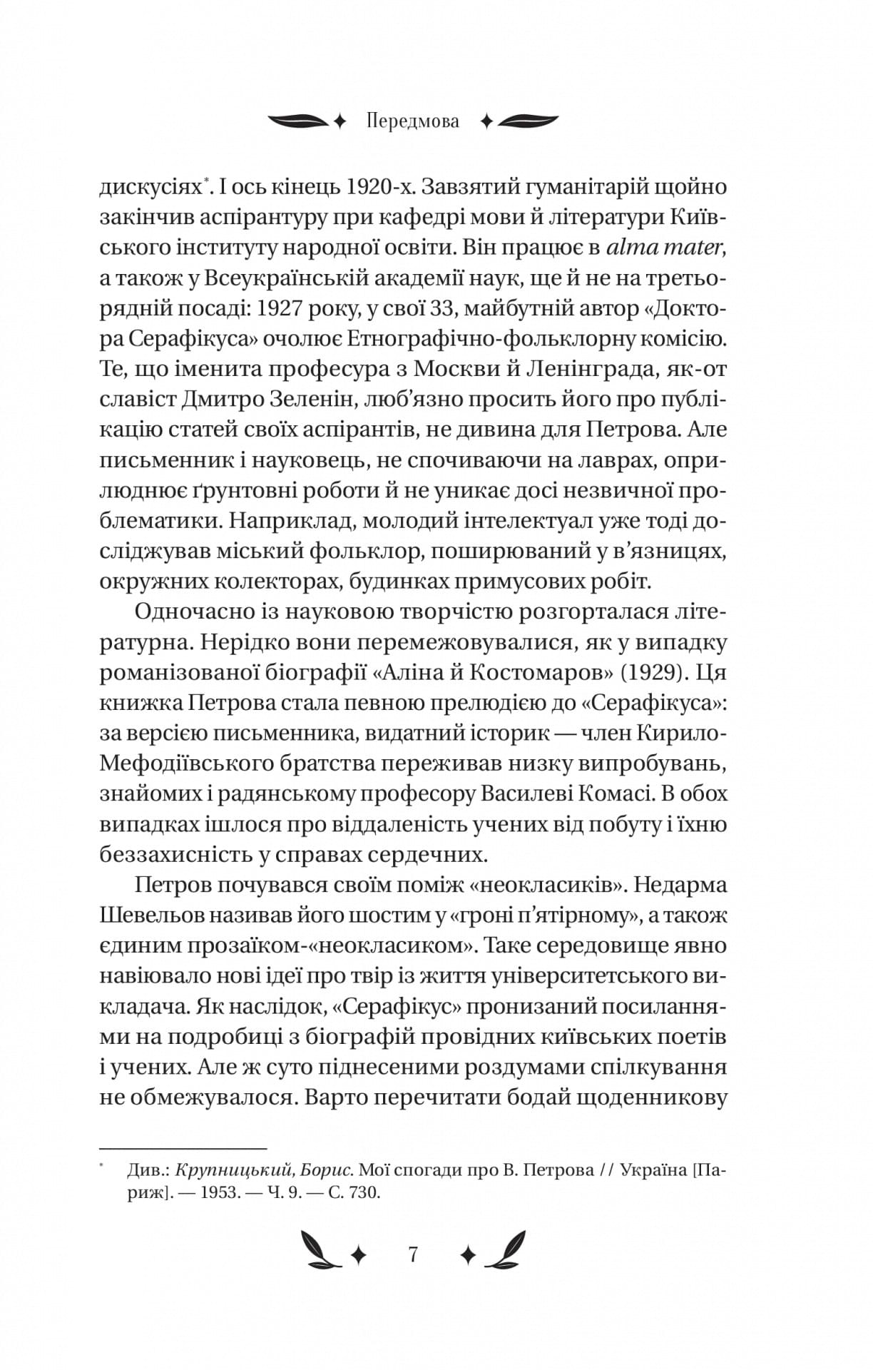 Серце професора — це енциклопедія пристрастей, прихованих за списками літератури й примітками. У «Докторі Серафікусі» воно пульсує в унісон із вибуховими хвилями історії. Воно поривається до аудиторій і бібліотек, але не може уникнути парків і модних кав’ярень, затишних ярів і диких завулків. Чи важко натрапити на хіпстерку у 1920-х роках? Що простіше — закохатися в таку дівчину чи в місто? Як залишатися українськими інтелектуалами після навали «хороших росіян»?.. Відповіді знають В. Домонтович і його химерні, зате переконливі персонажі. Один із найзагадковіших українських романів уперше друкується з розділами й фрагментами, які дивом уціліли в архіві.