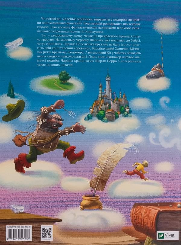 Тут, у зачарованому замку, чекає на прекрасного принца спляча красуня. На маленьку Червону Шапочку, яка поспішає до бабусі, чатує сірий вовк. Чарівна Попелюшка кружляє на балу й от-от втратить свій кришталевий черевичок. Відчайдушний Хлопчик-Мізинчик рятує братів від Людожера. А вигадливий Кіт у чоботях обводить цього злодюгу навколо пальця і з’їдає, коли Людожер набуває мишачої подоби. Чарівна країна казок Шарля Перро з нетерпінням чекає на юних читачів!