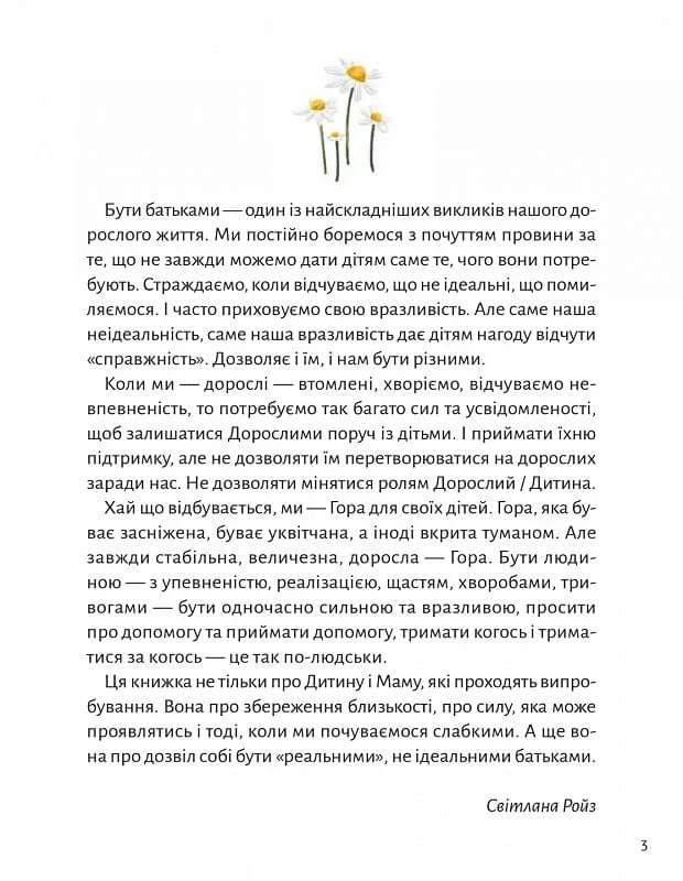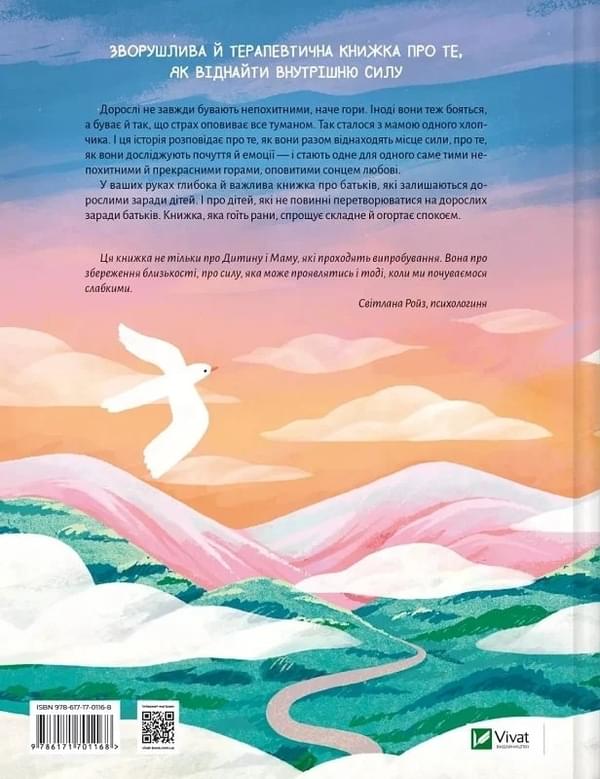Дорослі не завжди бувають непохитними, наче гори. Іноді вони теж бояться, а буває й так, що страх оповиває все туманом. Так сталося з мамою одного хлопчика. І ця історія розповідає про те, як вони разом віднаходять місце сили, про те, як вони досліджують почуття й емоції — і стають одне для одного саме тими непохитними й прекрасними горами, оповитими сонцем любові. У ваших руках глибока й важлива книжка про батьків, які залишаються дорослими заради дітей. І про дітей, які не повинні перетворюватися на дорослих заради батьків. Книжка, яка гоїть рани, спрощує складне й огортає спокоєм.