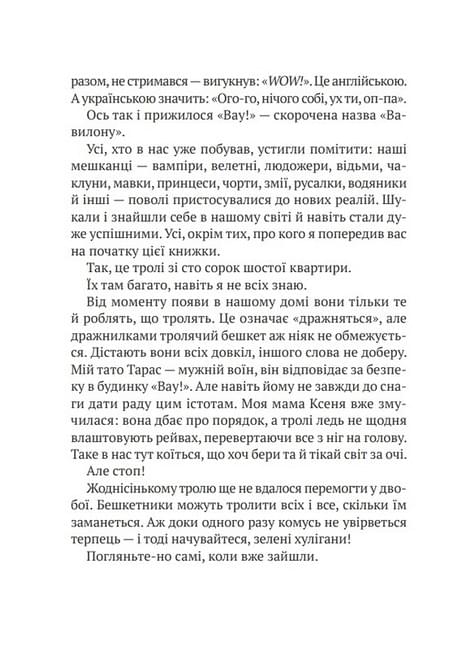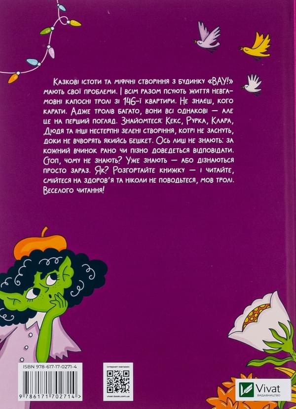 Казкові істоти та міфічні створіння з будинку ВАУ мають свої проблеми. І всім разом псують життя невгамовні капосні тролі зі 146-ої квартири. Не знаєш, кого карати. Адже тролів багато, вони всі однакові — але це на перший погляд. Знайомтеся: Кекс, Рурка, Клара, Дюдя та інші нестерпні зелені створіння, котрі не заснуть, доки не вчворять якійсь бешкет. Ось лиш не знають: за кожний вчинок рано чи пізно доведеться відповідати. Стоп, чому не знають? Уже знають — або дізнаються просто зараз. Як? Відкривайте книжку — і читайте, смійтеся на здоров’я та ніколи не поводьте себе, мов тролі. Веселого читання!