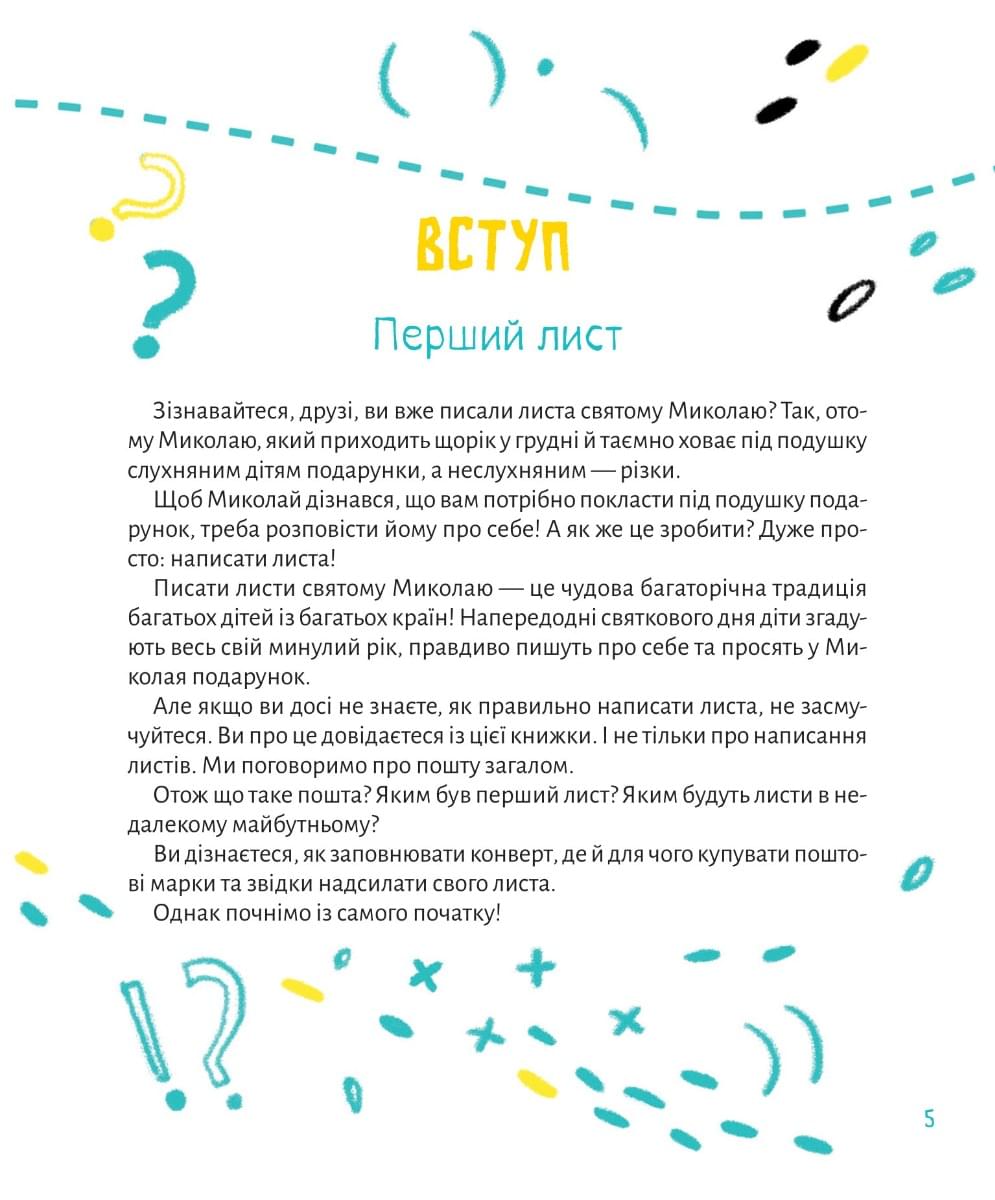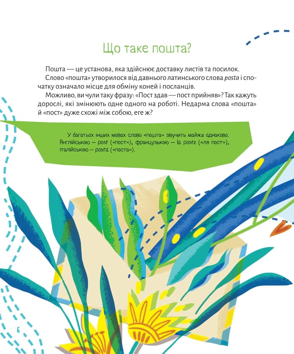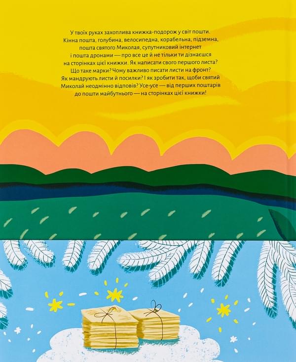 У твоїх руках захоплива книжка-подорож у світ пошти. Кінна пошта, голубина, велосипедна, корабельна, підземна, пошта святого Миколая, супутниковий інтернет і пошта дронами — про все це й не тільки ти дізнаєшся на сторінках цієї книжки. Як написати свого першого листа? Що таке марки? Чому важливо писати листи на фронт? Як мандрують листи й посилки? І як зробити так, щоби святий Миколай неодмінно відповів? Усе-усе — від перших поштарів до пошти майбутнього — на сторінках цієї книжки!