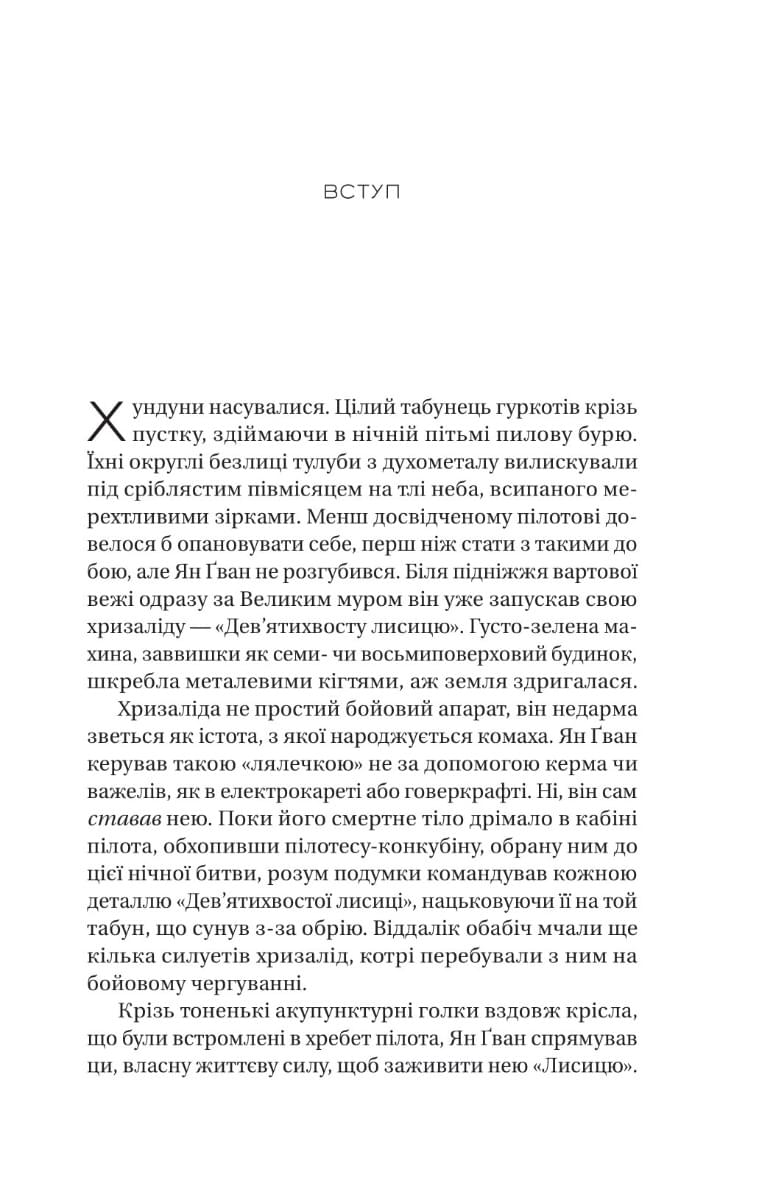 Коли сестра вісімнадцятирічної Ву Дзетянь гине, вона вирішує помститися, тому йде до лав армії, що боронить світ від космічних загарбників. Хризаліда, тобто бойова машина під назвою «Дев’ятихвоста лисиця», підпорядковується їй — і в Дзетянь прокидається сила, що стрясає землю. Отже, тепер їй до снаги не просто помста, а ще й цілковитий бунт проти всієї зашкарублої системи суспільства. Що буде, коли її, Залізну Вдову, примусять працювати з Лі Шимінем, Залізним Демоном і пілотом «Жар-птаха»? Дзетянь має з’ясувати, чому пілотна система передбачає позбавлення життєвої енергії саме жінок і чому чоловіки бояться їх навіть більше, ніж ворожих хундунів.