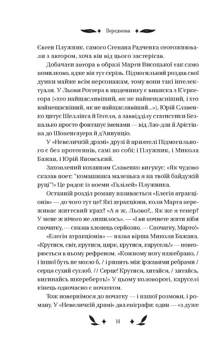 Валер’ян Підмогильний хотів написати роман, у якому майстром корабля буде жінка. І написав «Невеличку драму» — роман про нові взаємини, новий побут, нову мораль і вічні питання, які постають у несподіваних учудненнях доби технічного прогресу. Шалена ірраціональна пристрасть чи холодний раціональний розрахунок — хто вийде переможцем із двобою? Чи перемога взагалі можлива, якщо і кохання, і страждання — лише стандартні реакції білка? Підмогильний майстерно розігрує на камерній сцені невеличку драму, назва якій — життя. Це один з найкращих філософських романів в українській літературі ХХ сторіччя.