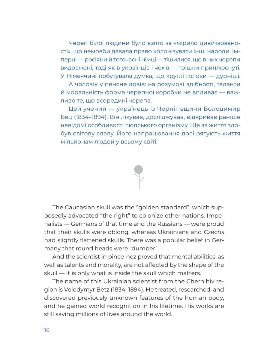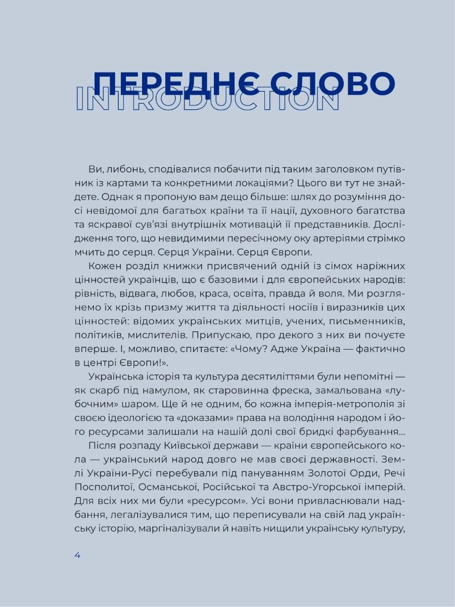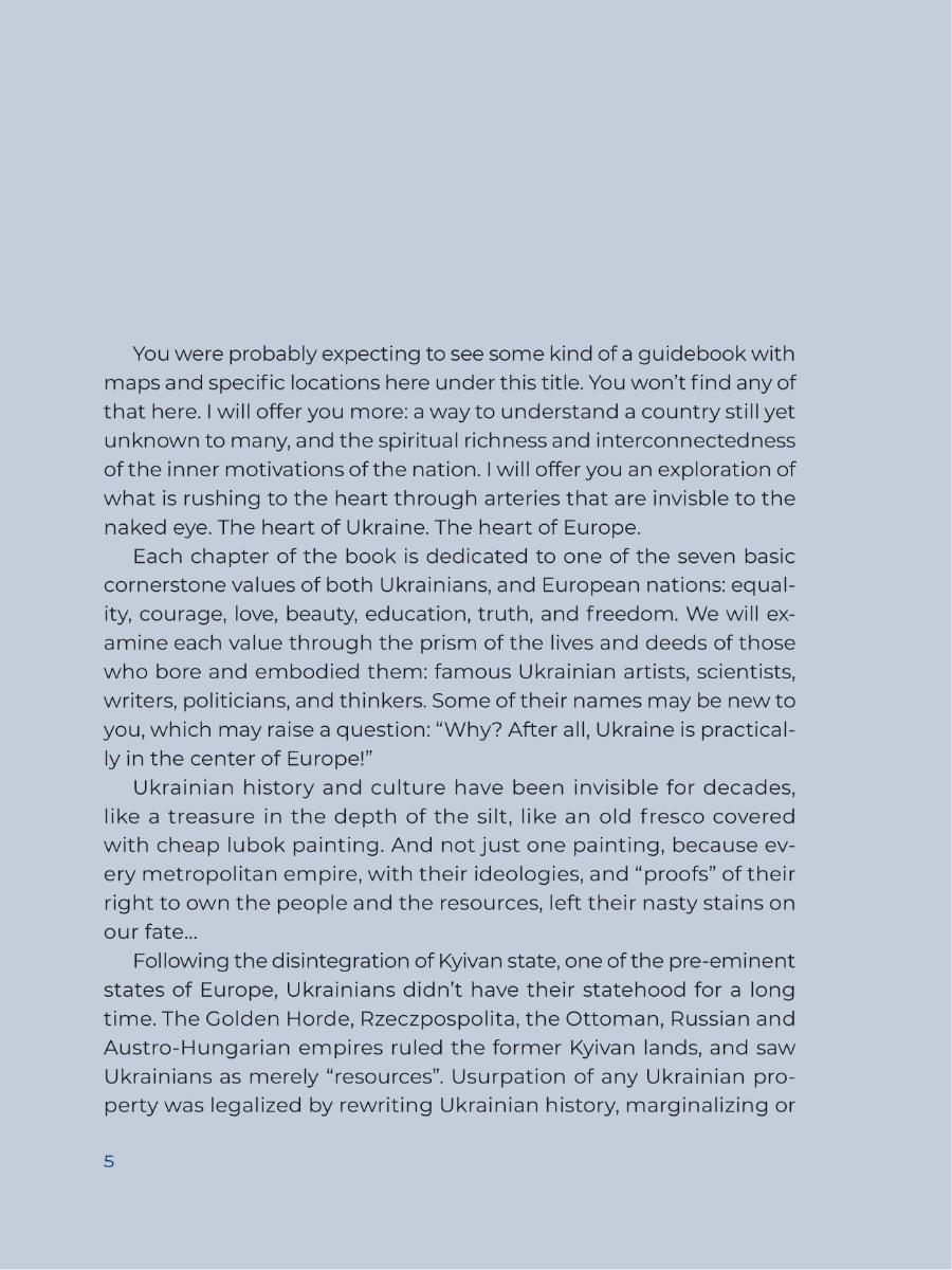 Запрошую в мандрівку долями тих, що називали себе українцями і своєю працею робили життя інших ліпшим. Тих, чиї цінності, принципи та віра в людство стали гармонійною частиною європейської культури. Ми завітаємо до мислителя Григорія Сковороди, який вчить слухати серце й бути вільним; до художниці Катерини Білокур, яка попри всі негаразди свого життя дарувала людству прекрасне; до Володимира Беца, який довів рівність націй на анатомічному рівні. Я відкрию тобі ще чимало цікавих облич.
