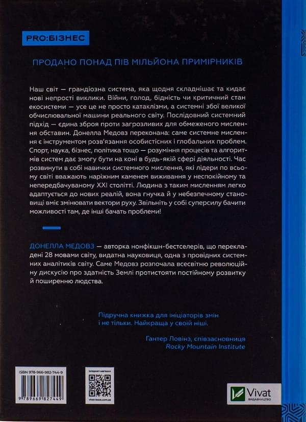Наш світ — грандіозна система, яка щодня складнішає та кидає нові непрості виклики. Війни, голод, бідність чи критичний стан екосистеми — усе це не просто катаклізми, а системні збої великої обчислювальної машини реального світу. Послідовний системний підхід — єдина зброя проти загрозливих для обмеженого мислення обставин. Донелла Медовз переконана: саме системне мислення є інстру ментом розв’язання особистісних і глобальних проблем. Спорт, наука, бізнес, політика тощо — розуміння процесів та алгоритмів систем дає змогу бути на коні в будь-якій сфері діяльності. Час розвинути в собі навички, які лідери по всьому світі вважають наріжним каменем виживання в неспокійному та непередбачуваному ХХІ столітті. Людина з критичним мисленням легко адаптується до нових реалій, вона гнучка й у небезпечному становищі вміє швидко змінювати вектори руху. Звільніть у собі суперсилу бачити можливості там, де інші бачать проблеми!