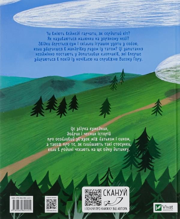 Чи вміють ведмеді гарчати, як сердитий кіт? Як називаються малюнки на зоряному небі? Звідки береться сум і скільки іграшок узяти з собою, коли збираєшся в мандрівку разом із татом? Ці запитання неодмінно постають у допитливих хлопчаків, які вперше збираються в похід із ночівлею на справжню Високу Гору.