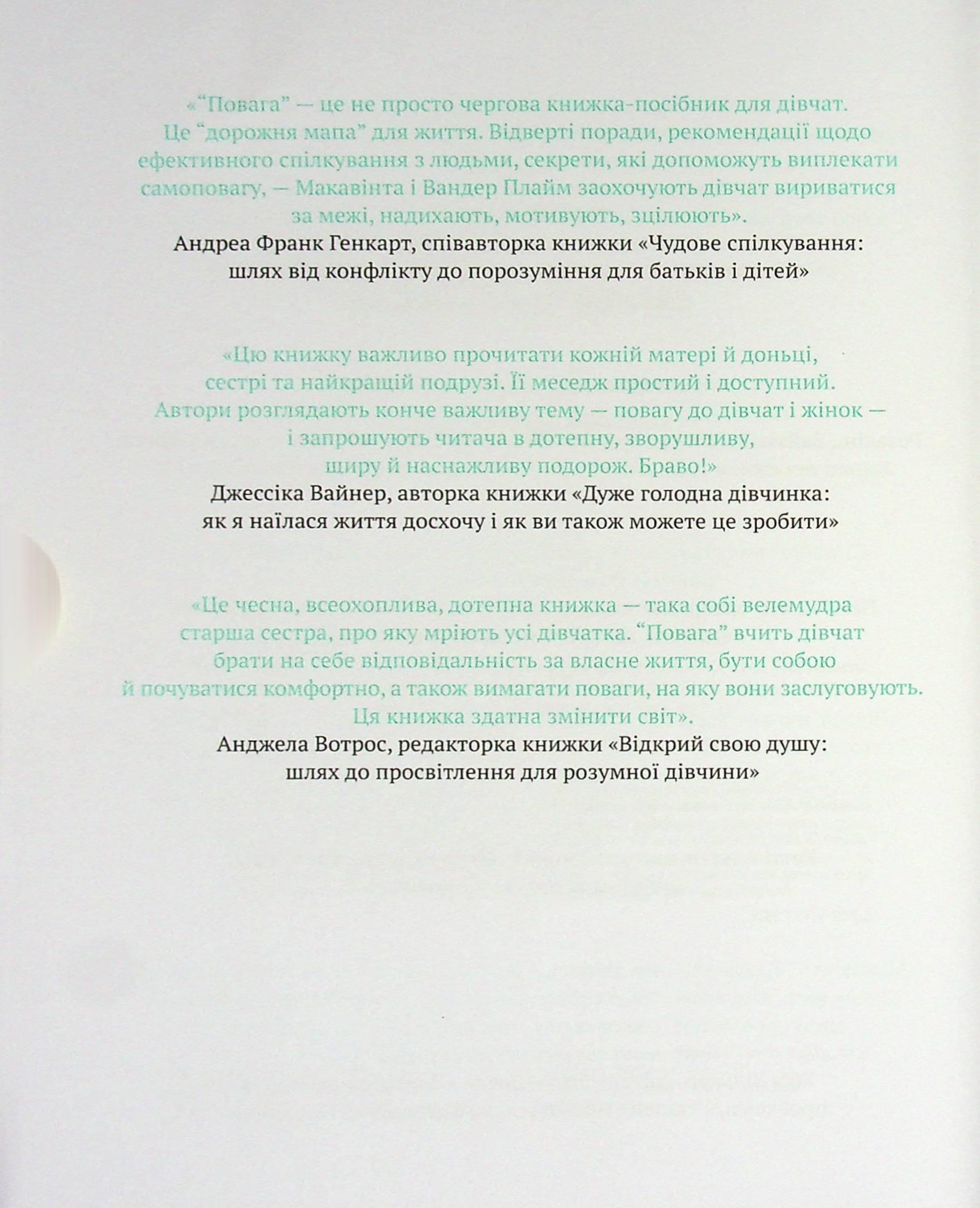 Кожна дівчина має право на повагу й хоче, щоб її цінували як особистість, чули її думку й не примушували роботи те, що некомфортно. А для цього передусім потрібно навчитися любити й поважати саму себе. Ця книжка — помічник з упевненості в собі: у своєму тілі, ролі у стосунках, спілкуванні з однолітками й старшими. Людина, яка навчиться цінувати себе, зможе легко розпізнати маніпулятора, не терпітиме дискримінації та впевнено відстоюватиме свої права. Тож «Повага» — хороша підготовка для дівчат, які поки бояться постояти за себе й не знають, які вони насправді чудові й цінні.