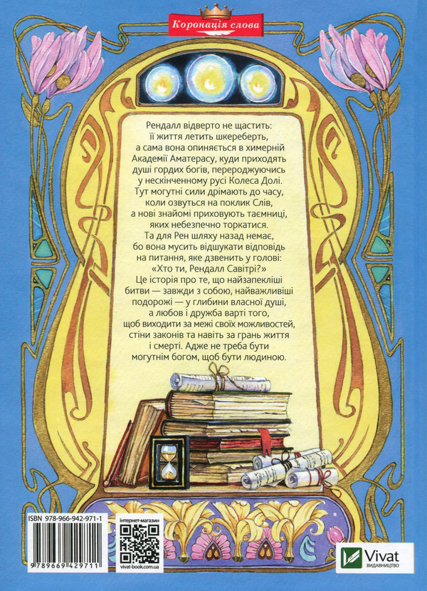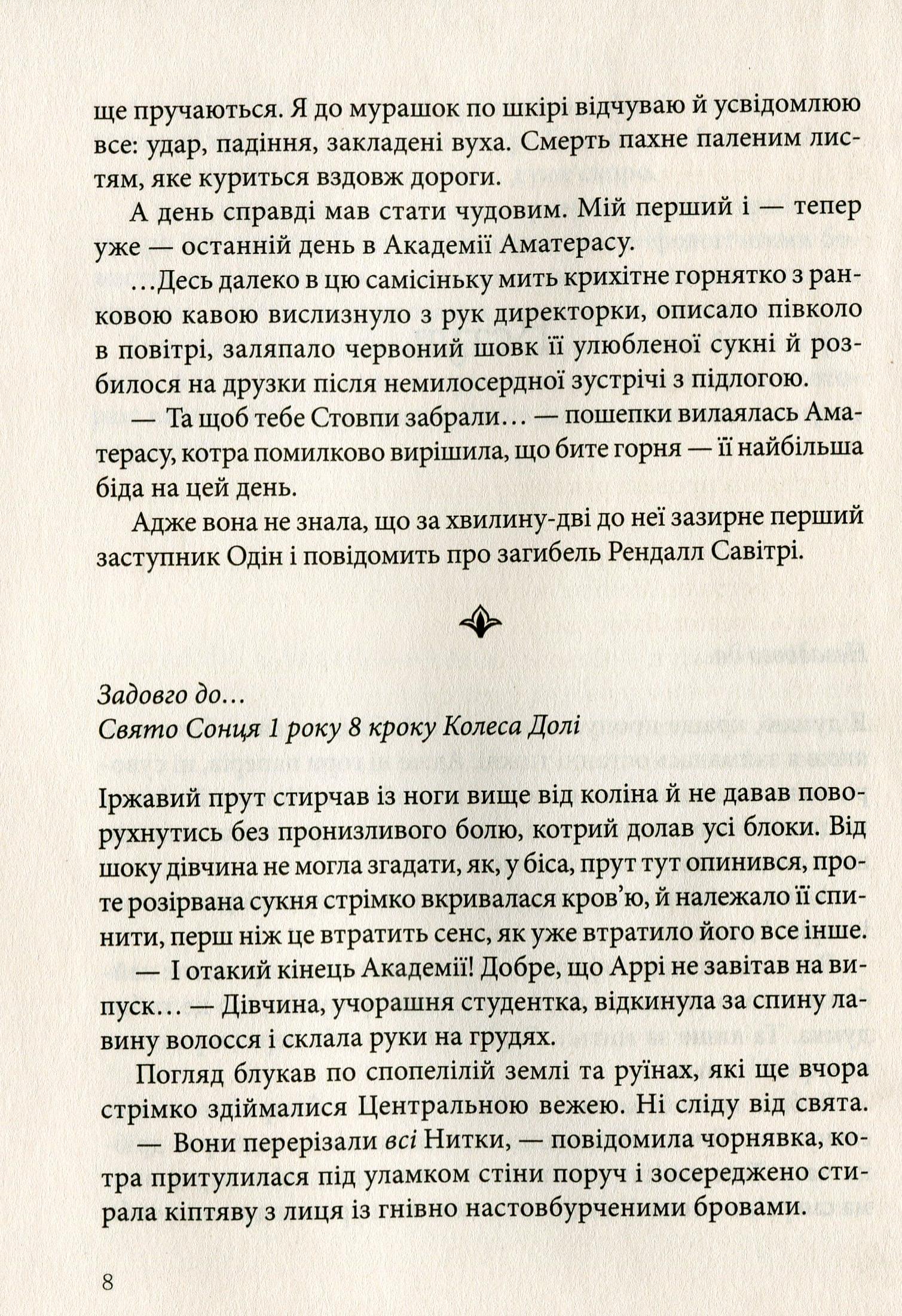 Рендалл відверто не щастить: її життя летить шкереберть, а сама вона опиняється в химерній Академії Аматерасу, куди приходять душі гордих богів, перероджуючись у нескінченному русі Колеса Долі. Тут могутні сили дрімають до часу, коли озвуться на поклик Слів, а нові знайомі приховують таємниці, яких небезпечно торкатися. Та шляху назад для Рен немає, бо вона мусить відшукати відповідь напитання, яке дзвенить у голові: «Хто ти, Рендалл Савітрі?»