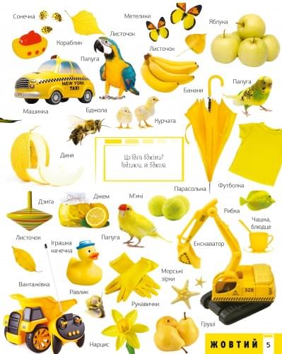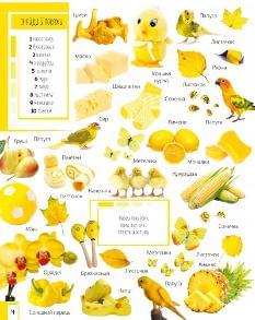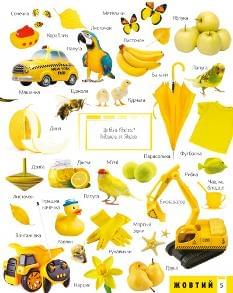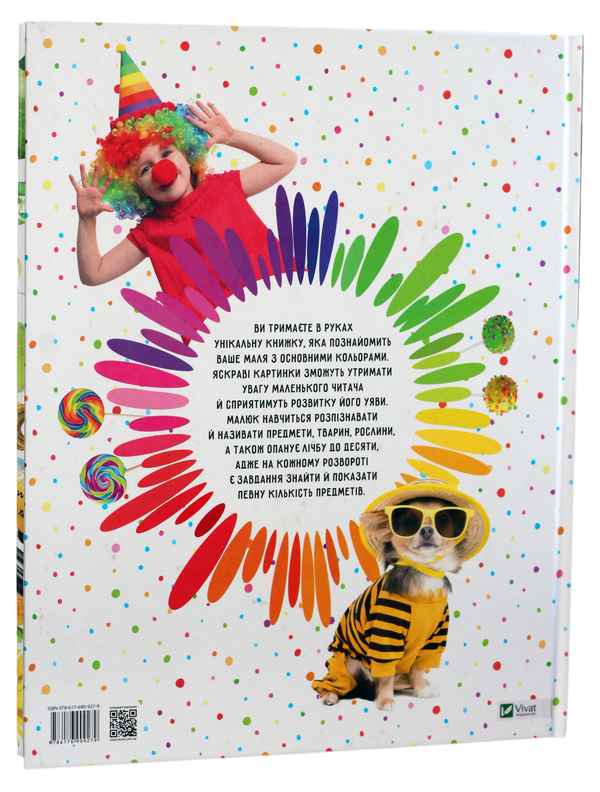Ви тримаєте в руках унiкальну книжку, яка познайомить ваше маля з основними кольорами. Яскравi картинки зможуть утримати увагу маленького читача й сприятимуть розвитку його уяви. Малюк навчиться розпiзнавати й називати предмети, тварин, рослини, а також опанує лiчбу до десяти. Адже на кожному розворотi завдання знайти й показати певну кiлькiсть предметiв.